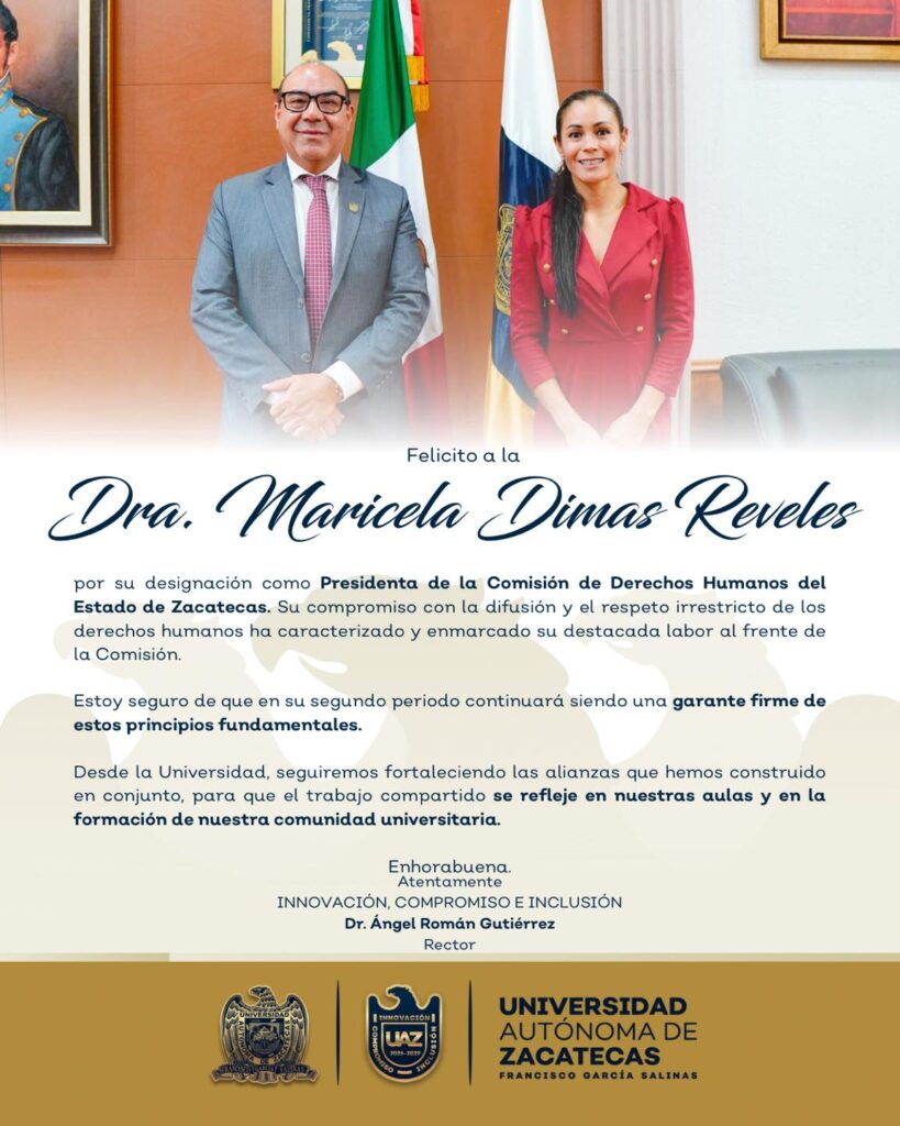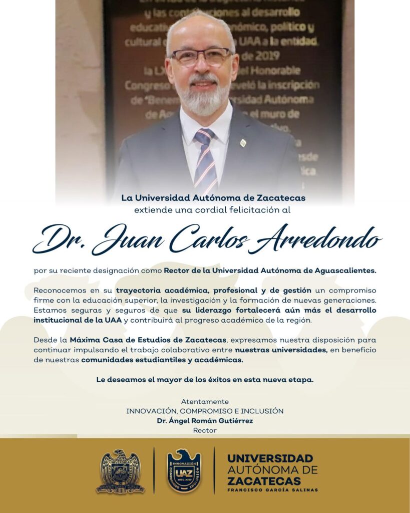 Rector Dr. Ángel Román Gutiérrez, felicita al Gobernador Lic. David Monreal Ávila por su 4to. INFORME