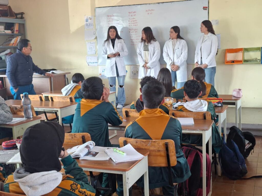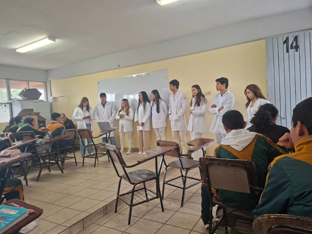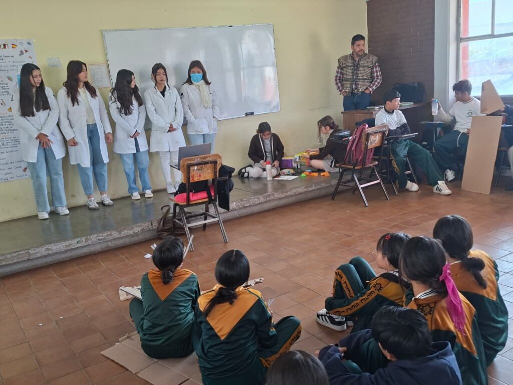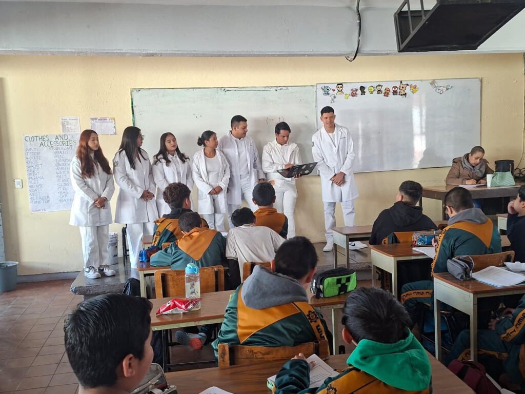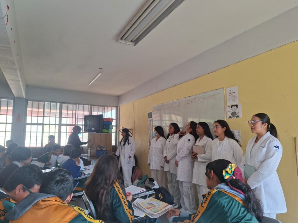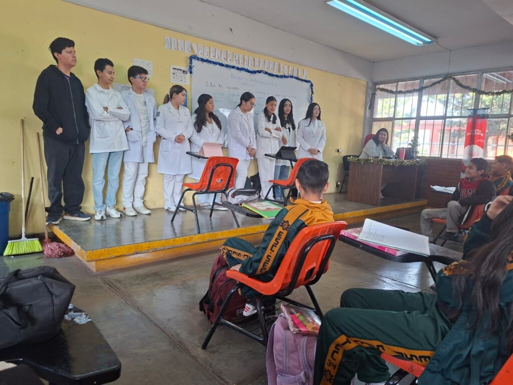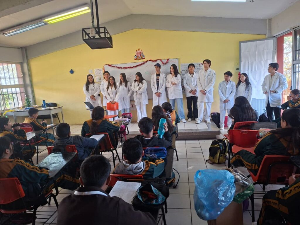 Durante la jornada, los universitarios abordaron temas relacionados con los aspectos biopsicosociales que deben considerarse en la atención de pacientes. Asimismo, compartieron con los estudiantes de secundaria información sobre las distintas modalidades de atención médica —institucional, privada y alternativa— que forman parte de las opciones disponibles para la ciudadanía.