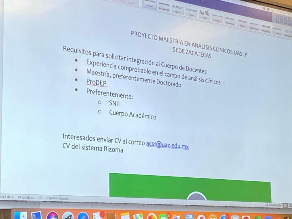 De igual manera informó que existe la oportunidad para que docentes de la UAZ se integren al cuerpo de docentes de la maestría, los cuales deberán contar con ciertos requisitos como, el tener experiencia comprobable en el campo de los análisis clínicos; contar con maestría o preferentemente doctorado; ser perfil del Programa para el Desarrollo Profesional Docente (ProDep) y ser miembro del Sistema Nacional de Investigadores (SNI) o pertenecer a un cuerpo académico.