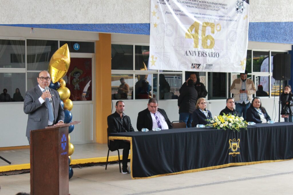 La ceremonia tuvo lugar en el patio principal del centro, donde el rector de la UAZ, Ángel Román Gutiérrez, destacó que este aniversario representa décadas de esfuerzo colectivo, trayectorias entregadas y una profunda vocación por la infancia. “Son años de compromiso de compañeras y compañeros que han dedicado parte de su vida a esta institución, contribuyendo al bienestar y formación de los pequeños universitarios”, expresó.