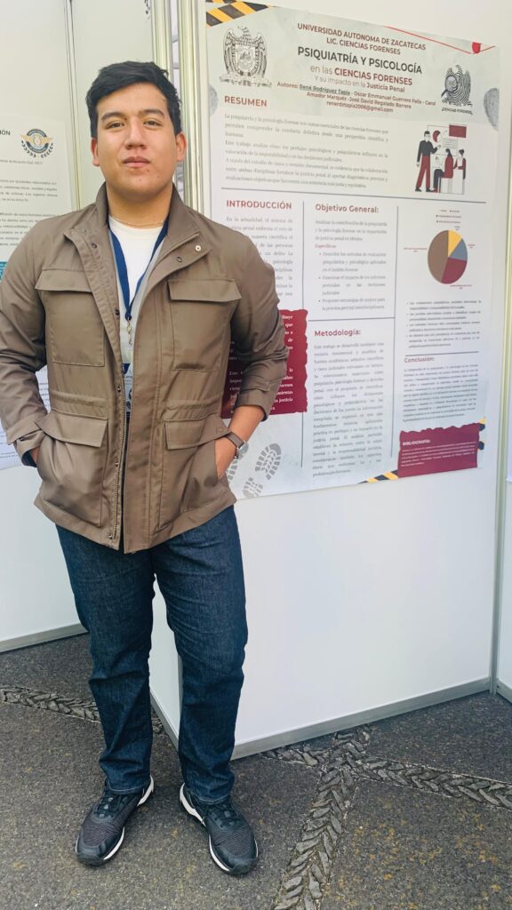 Mediante ponencias conocieron cómo han crecido las Ciencias Forenses, así como los nuevos métodos que se emplean, desapariciones forzadas, entre otros temas, declaró el alumno de cuarto semestre de la Ciencias Forenses de la UAZ, Gael Pérez Carrillo, quien junto con su equipo presentó un cartel en el congreso titulado “Método de Widmark”, el cual es un método de identificación de alcoholemia en sangre.