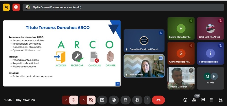Con la participación de más de 120 personas en modalidad virtual, durante tres días se logró identificar con claridad qué son los datos personales y sensibles en el contexto del servicio público. Además, se reconocieron los principios rectores del tratamiento de datos, el marco normativo nacional e internacional aplicable, la correcta aplicación de los Derechos ARCO en las instituciones, así como la prevención de riesgos y malas prácticas en el manejo de información personal.