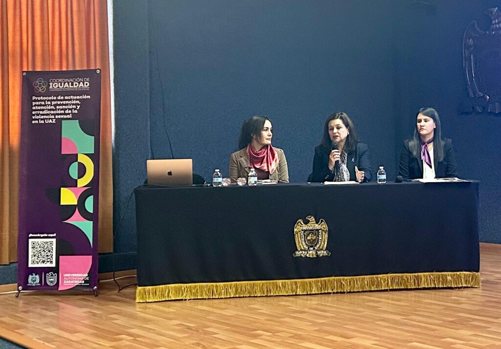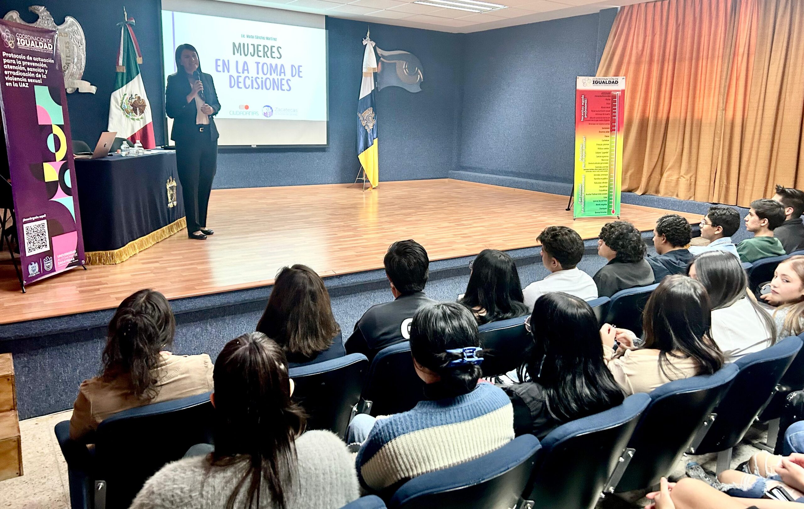 Desde la Coordinación de Igualdad de la Universidad Autónoma de Zacatecas (UAZ) se impulsa la creación de espacios de reflexión en torno a la vida democrática y al fortalecimiento de nuestras instituciones. En este marco se presentó la conferencia “Mujeres en la toma de decisiones”, realizada en la Unidad Académica de Derecho (UAD), con la participación de la directora del Instituto Municipal de las Mujeres en Miguel Auza, Madai Sánchez Martínez.