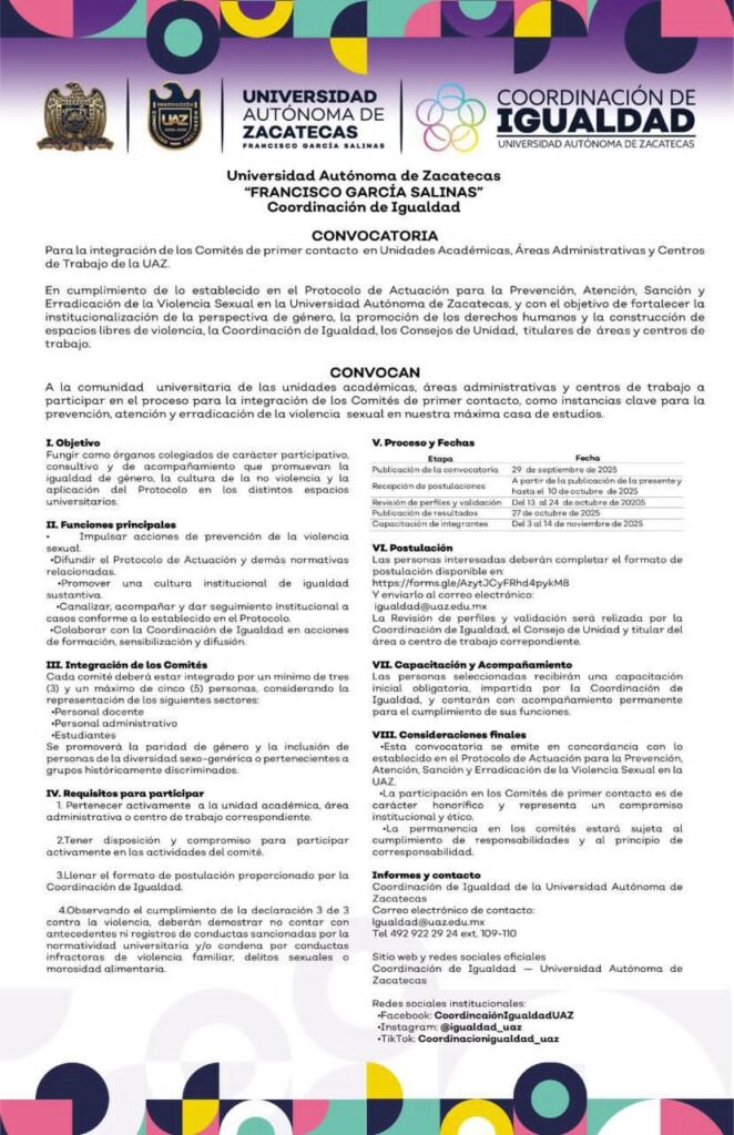 La Universidad Autónoma de Zacatecas (UAZ) y la Coordinación de Igualdad convocan a la alumnos, docentes y trabajadores de las diferentes Unidades Académicas, Áreas Administrativas y Centros de Trabajo de la UAZ a participar en el proceso para la integración de los Comités de primer contacto, como instancias clave para la prevención, atención y erradicación de la violencia sexual en la Máxima Casa de Estudios.