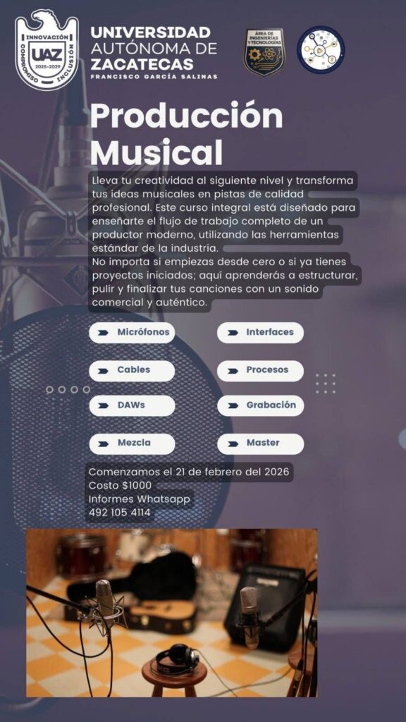 El “Curso de producción musical”, que comenzará también el 21 de febrero de 2026, permitirá a las y los participantes transformar sus ideas en pistas de calidad comercial. Durante el curso se abordarán aspectos esenciales de grabación, mezcla y masterización, brindando herramientas para quienes buscan incursionar en la industria musical.