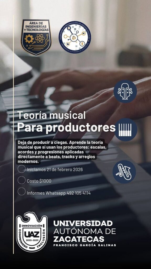 La “Teoría musical para productores” con inicio el 21 de febrero, ofrecerá conocimientos aplicados sobre escalas, acordes y progresiones. Estos contenidos se vinculan directamente con la producción de beats y arreglos modernos, aportando bases sólidas para la creación musical contemporánea.
