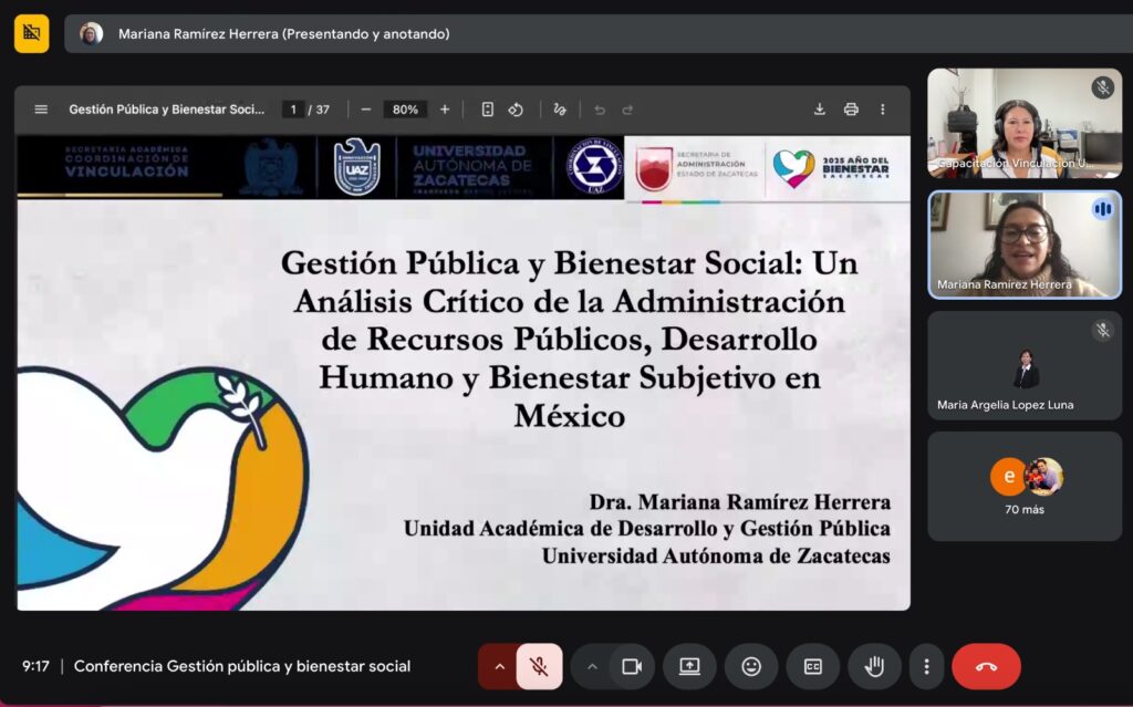 Como parte del proceso continuo de formación impulsado por la vinculación entre la Universidad Autónoma de Zacatecas (UAZ) y la Secretaría de Administración del Gobierno del Estado de Zacatecas (SAD), se llevó a cabo la conferencia titulada “Gestión Pública y Bienestar Social”, dirigida al personal administrativo y directivo de la administración pública estatal. La ponencia fue impartida por la docente investigadora Mariana Ramírez Herrera, adscrita a la Unidad Académica de Desarrollo y Gestión Pública de la UAZ, en el marco del Programa de Capacitación de la Coordinación de Vinculación de la universidad.