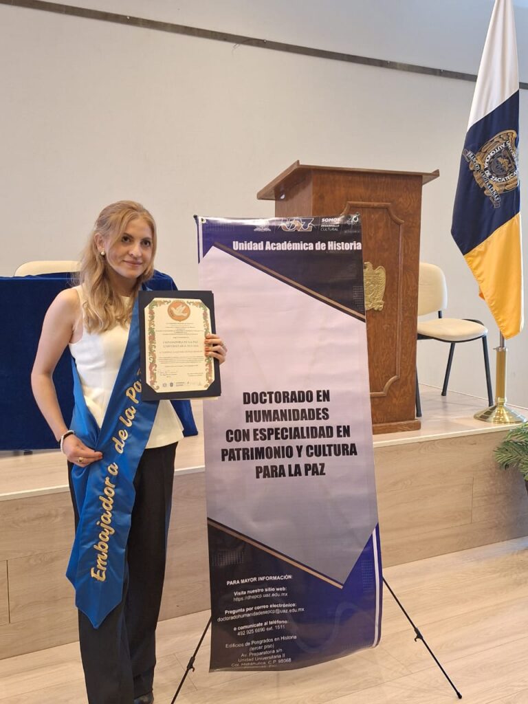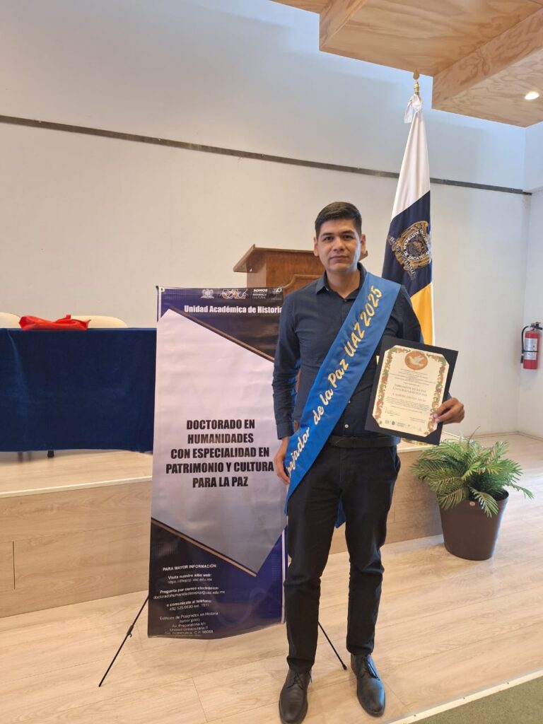 En conmemoración del Día Internacional de la Paz, 21 de septiembre, donde se recuerda la importancia de fomentar la cultura del diálogo, la inclusión y la solidaridad en un mundo donde aún persisten conflictos, desigualdades y violencias, el Doctorado en Humanidades con Especialidad en Patrimonio y Cultura para la Paz perteneciente a la Unidad Académica de Historia (UAH) de la Universidad Autónoma de Zacatecas (UAZ), realizó la entrega de nombramientos a los Embajadores de la Paz Universitarios, Yersinia Muñoz Moreno y Samuel Gálvez Salas.