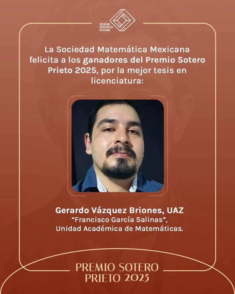 Con el trabajo “Número de independencia de la gráfica de doble vértice de suma de gráficas”, el egresado de la Unidad Académica de Matemáticas (UAM), Gerardo Vázquez Briones, obtuvo el premio “Sotero Prieto 2025″que otorga la Sociedad Matemática Mexicana (SMM).