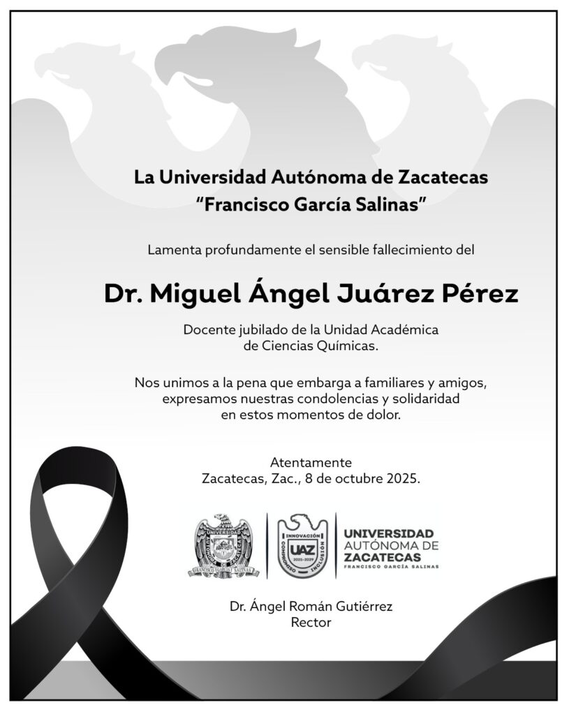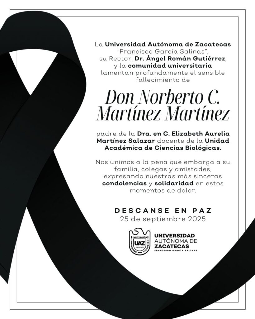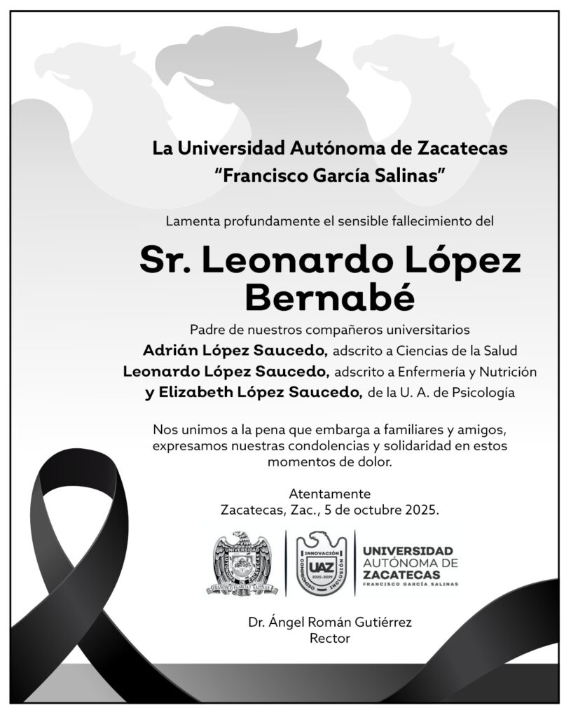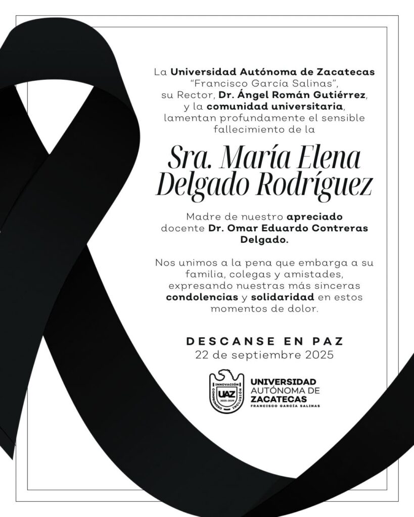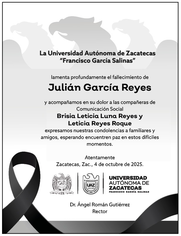 Publicaciones respetuosas para comunicar el sensible fallecimiento de un universitario perteneciente o jubilado de la Universidad Autónoma de Zacatecas, o de algún familiar de dicha comunidad universitaria, en donde se expresan condolencias y se desea pronta resignación ante la irreparable pérdida.