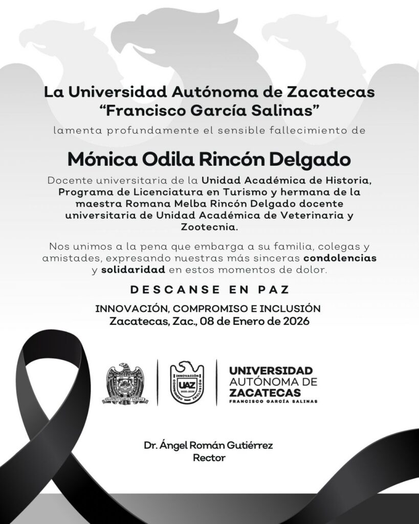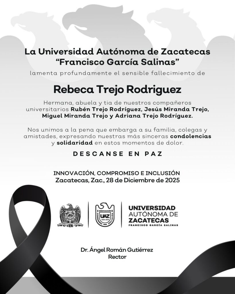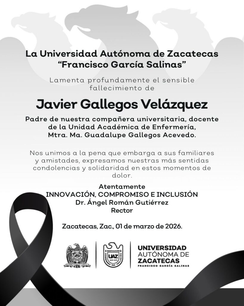 Publicaciones respetuosas para comunicar el sensible fallecimiento de un universitario perteneciente o jubilado de la Universidad Autónoma de Zacatecas, o de algún familiar de dicha comunidad universitaria, en donde se expresan condolencias y se desea pronta resignación ante la irreparable pérdida.