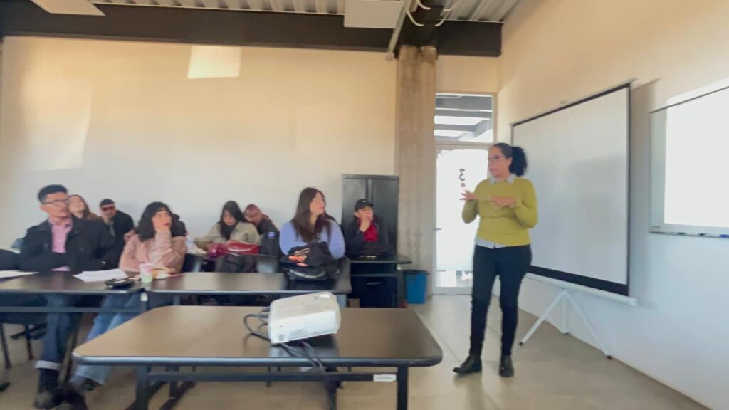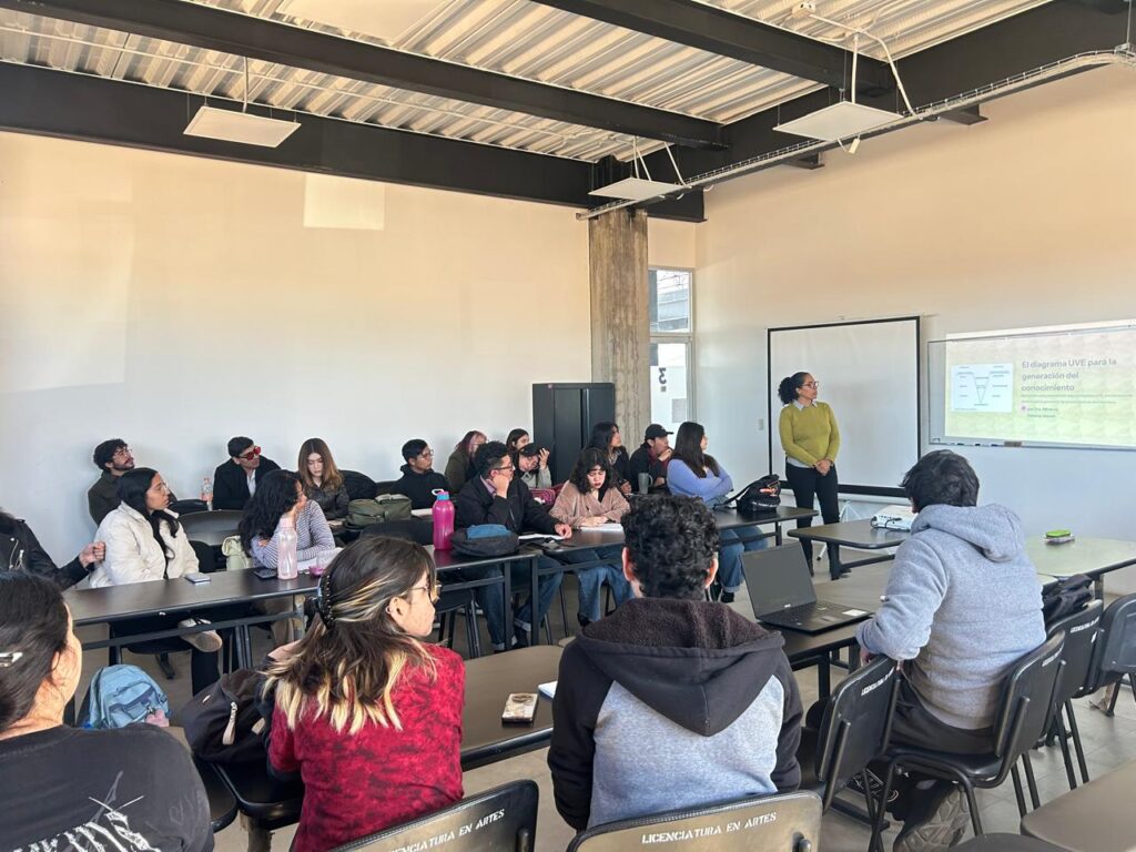 Estudiantes de la Licenciatura en Artes de la Universidad Autónoma de Zacatecas (UAZ), participaron en una sesión formativa dedicada al fortalecimiento de sus competencias en investigación, a través de la conferencia “El diagrama UVE para la generación del conocimiento”, impartida por la docente investigadora Minerva Esparza Jáquez, integrante del Sistema Nacional de Investigadoras e Investigadores (SNII).
