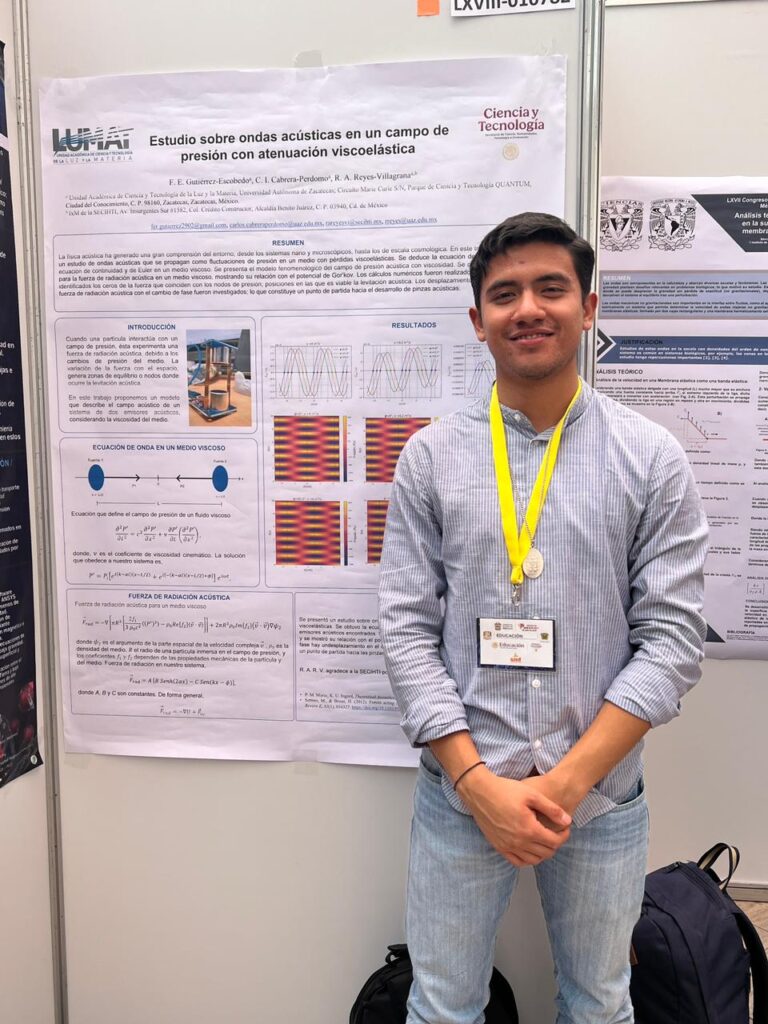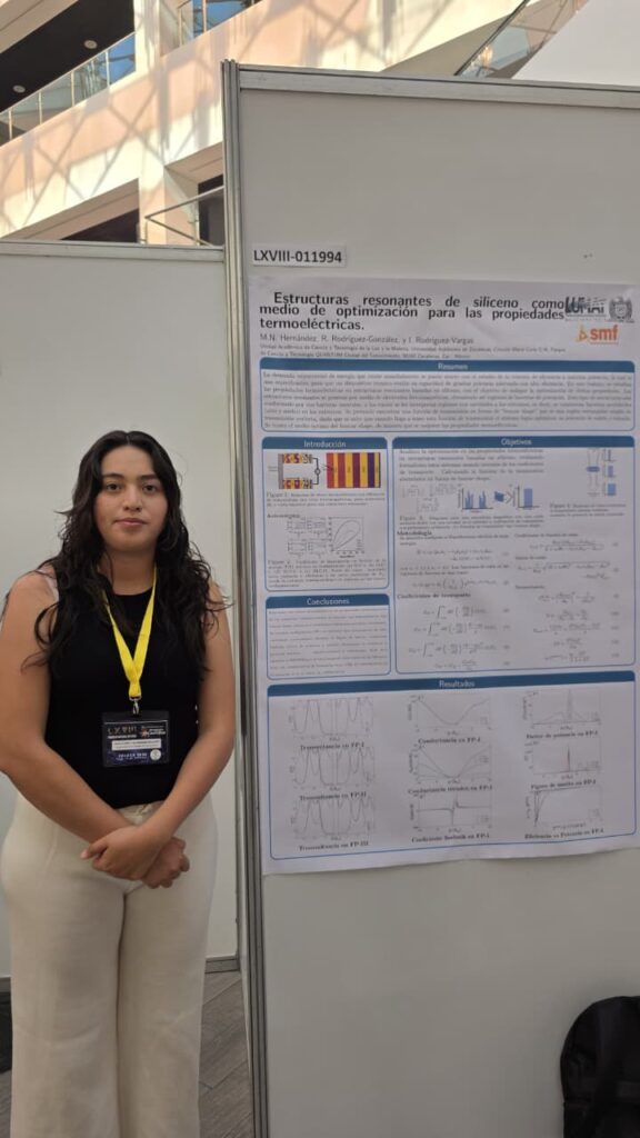 Con el propósito de fortalecer su formación científica y difundir los avances de la investigación universitaria, los estudiantes de Maestría en Ciencia y Tecnología de la Luz y la Materia, Marla Nayeli Hernández y Efraín Gutiérrez Escobedo, pertenecientes a la Unidad Académica de Ciencia y Tecnología de la Luz y la Materia (LUMAT) de la Universidad Autónoma de Zacatecas (UAZ), participaron en el LXVIII Congreso Nacional de Física, organizado por la Sociedad Mexicana de Física (SMF).