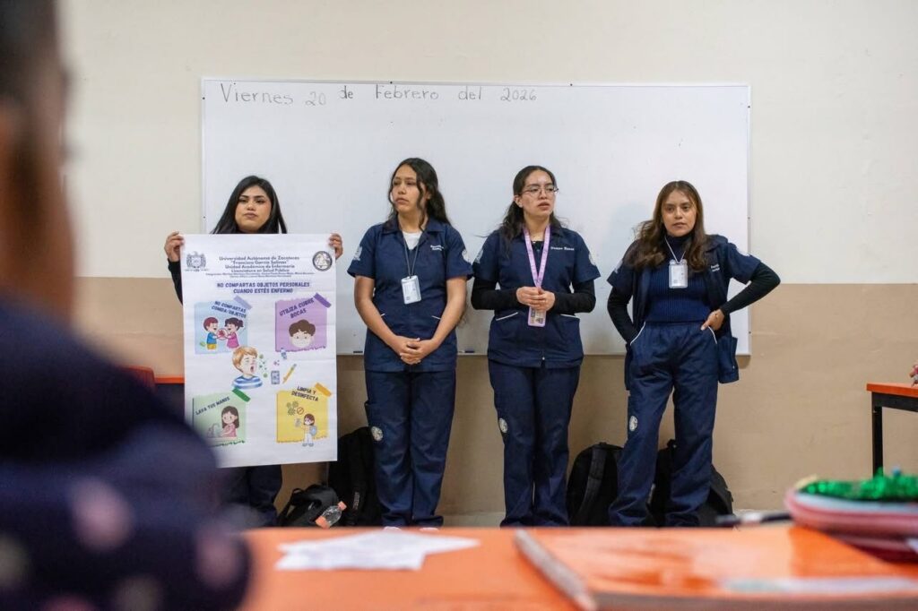 Como parte de sus prácticas profesionales y del compromiso social de la Universidad Autónoma de Zacatecas (UAZ), estudiantes de la Licenciatura en Salud Pública del Área de Ciencias de la Salud (ACS), llevaron a cabo una jornada educativa en la Escuela Primaria General Enrique Estrada, enfocada en la prevención de enfermedades transmisibles, particularmente infecciones respiratorias agudas.