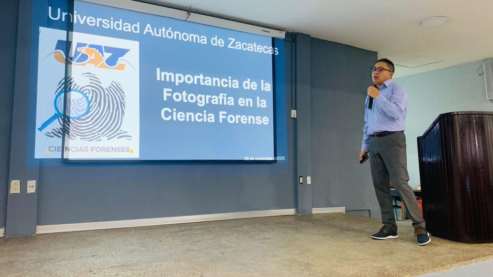 La Licenciatura en Ciencias Forenses perteneciente al Área de Ciencias de la Salud (ACS) de la Universidad Autónoma de Zacatecas (UAZ), recibió al perito técnico “B” en fotografía forense del Centro Federal Pericial Forense de la Fiscalía General de la República (FGR), Juan José Medina Torres, quien impartió a los estudiantes una charla introductoria sobre el papel esencial que desempeña la documentación fotográfica en los procesos periciales.