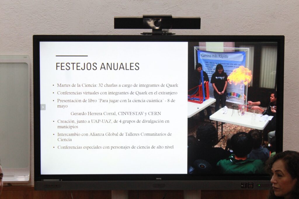 La directora subrayó también que Quark ha tenido presencia en 25 municipios de Zacatecas, 26 estados de México y 24 países de cuatro continentes, y agradeció la generosidad y compromiso de los voluntarios, sin los cuales —afirmó— el Museo de Ciencias no podría funcionar.