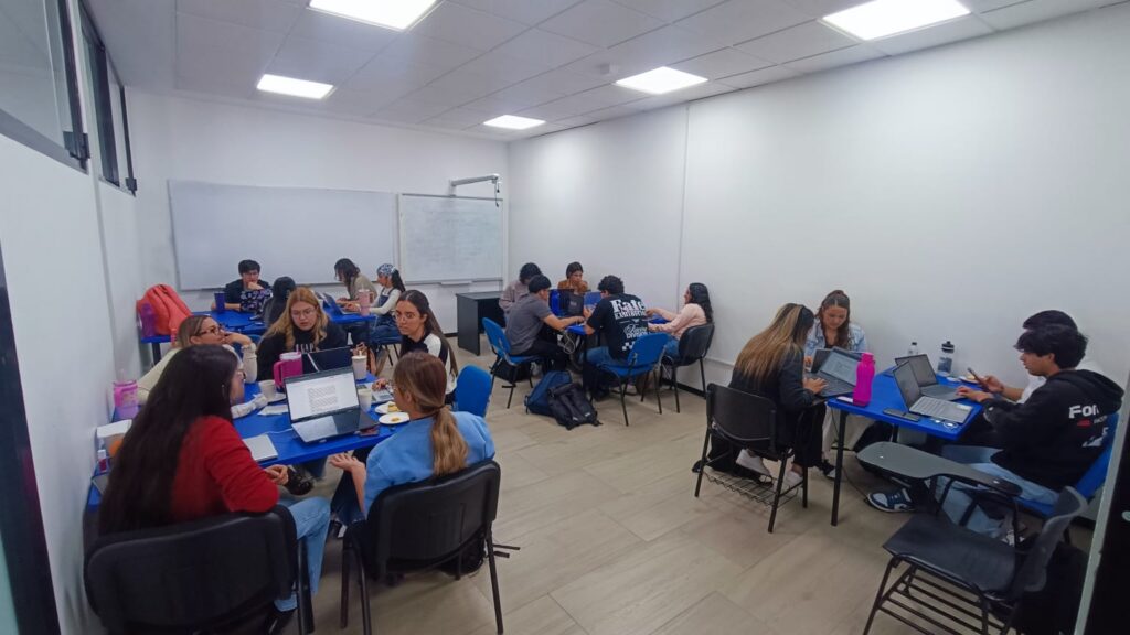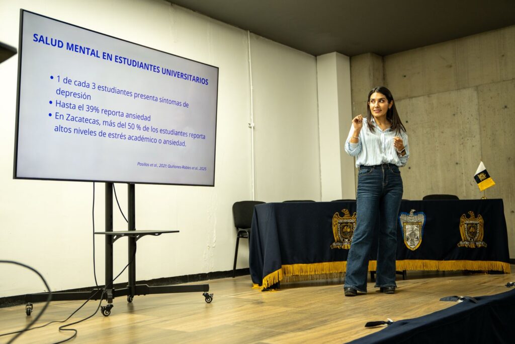 Durante su intervención, la especialista destacó que el propósito central de la charla es invitar a las y los estudiantes a observar las situaciones cotidianas —en particular aquellas relacionadas con la vida universitaria y la salud mental— como oportunidades para generar soluciones de impacto.