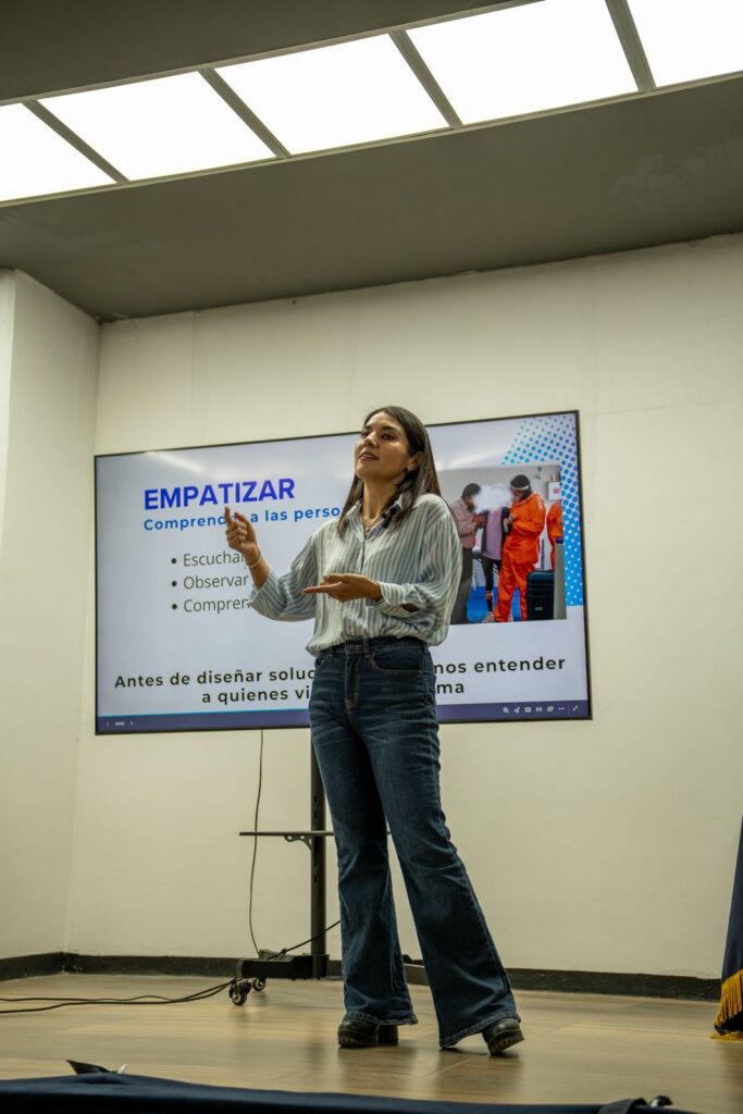 La académica presentó un enfoque práctico basado en la metodología Design Thinking, herramienta que permite estructurar el proceso de innovación y dar forma a proyectos desde la identificación de necesidades reales. La conferencia se desarrolló en cuatro momentos: primero, conectar con la experiencia estudiantil para reconocer las problemáticas más cercanas; después, identificar y definir con claridad los problemas; posteriormente, aplicar el enfoque de Design Thinking como vía para transformar ideas en proyectos; y finalmente, cerrar con una actividad de reflexión que motivó a las y los asistentes a pensar en soluciones creativas y viables.