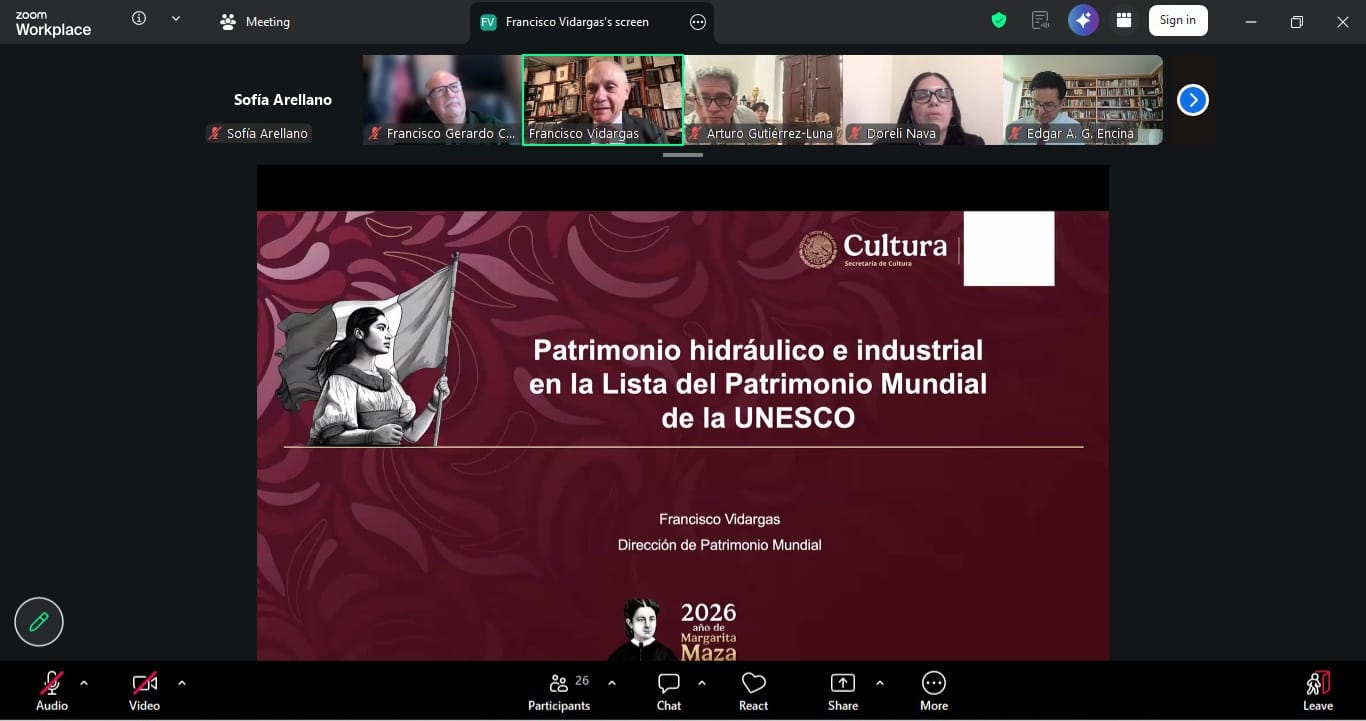 Durante su intervención, Vidargas abordó el tema del patrimonio hidráulico e industrial, el cual -señaló- forma parte de una categoría amplia que incluye vestigios de la cultura industrial con valor histórico, tecnológico, arquitectónico y social. Explicó que este tipo de patrimonio abarca desde fábricas, minas y talleres, hasta infraestructura energética, sistemas de transporte y espacios habitacionales vinculados a la actividad productiva.