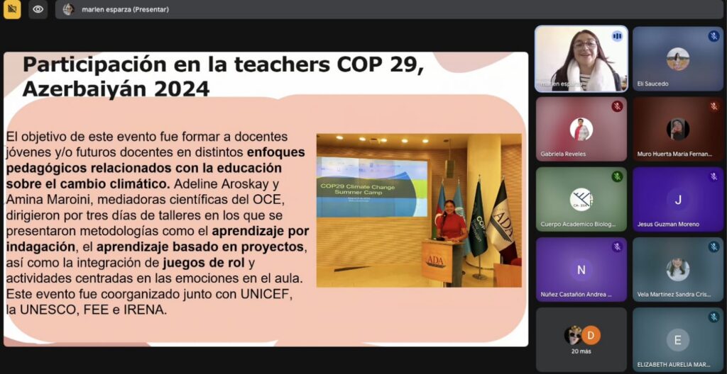 La ponencia estuvo a cargo de la docente Selene Marlen Esparza Rosales, quien compartió su experiencia en el “Proyecto América Latina para la Educación Climática y en la Teachers COP29” realizada en Azerbaiyán en 2024, donde representó a México. Su intervención destacó por presentar una propuesta pedagógica innovadora: la enseñanza vivencial de las ciencias en contextos de migración, mediante el programa CEVIC y el Aprendizaje Basado en Proyectos.