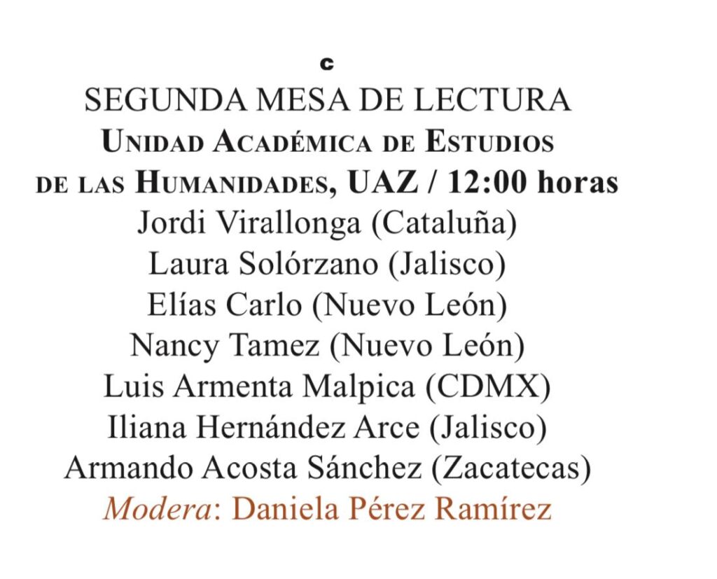 Como actividad de cierre del Seminario de Investigación, las y los participantes se sumaron al Festival Internacional de Poesía “Ramón López Velarde”, en una mesa especial de lectura donde participaron las y los poetas: Jordi Virallonga (Cataluña), Laura Solórzano (Jalisco), Elías Carlo (Nuevo León), Nancy Tamez (Nuevo León), Luis Armenta Malpica (CDMX), Iliana Hernández Arce (Jalisco) y Armando Acosta Sánchez (Zacatecas). La moderación estuvo a cargo de la docente Daniela Pérez Ramírez.