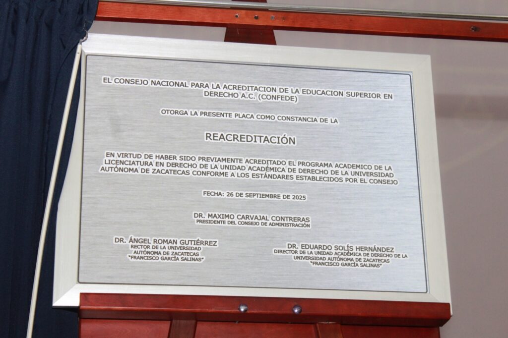 Así lo expresó el director de la Unidad Académica de Derecho (UAD) de la Universidad Autónoma de Zacatecas (UAZ), Eduardo Solís Hernández, tras recibir del Consejo Nacional para la Acreditación de la Educación Superior en Derecho (CONFEDE) —organismo reconocido por el Consejo para la Acreditación de la Educación Superior (COPAES)—, la constancia de reacreditación correspondiente al periodo 2025-2030.