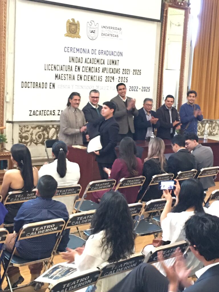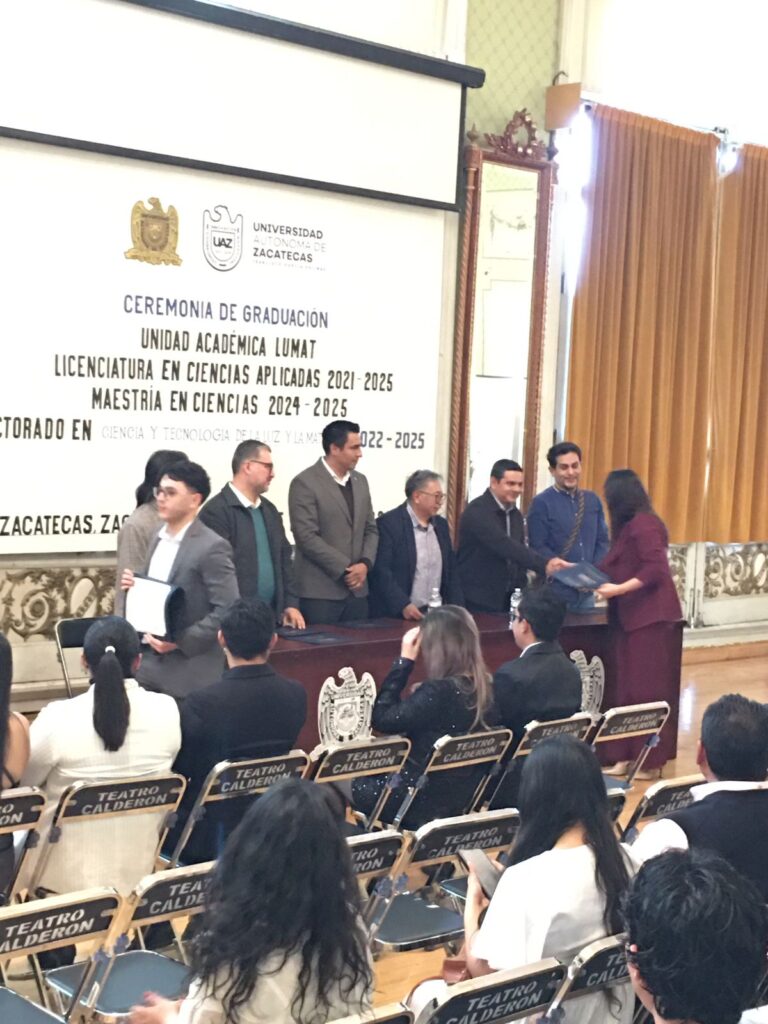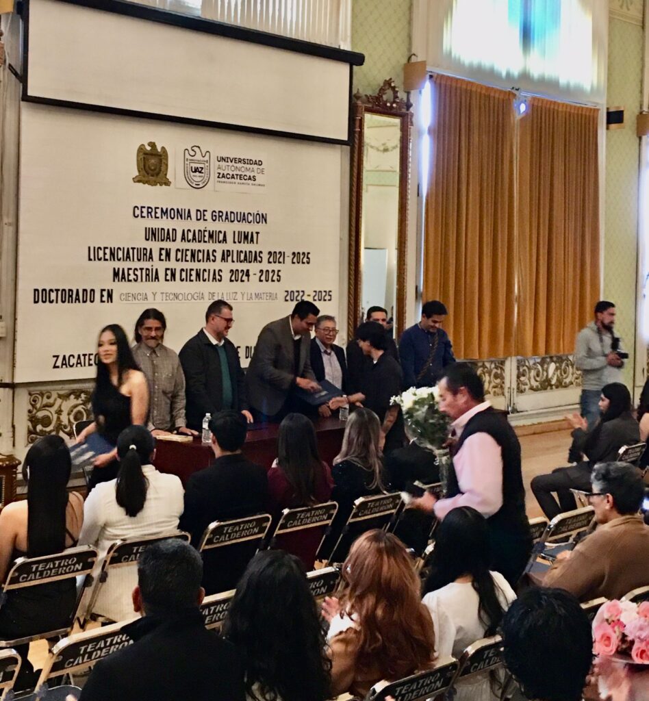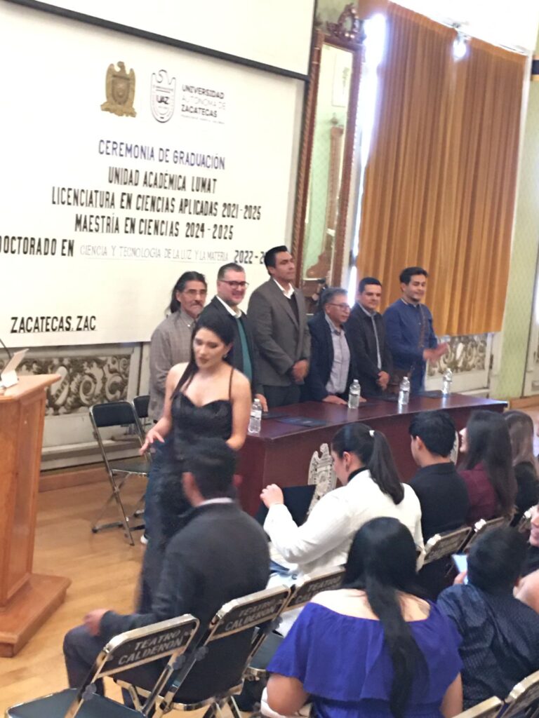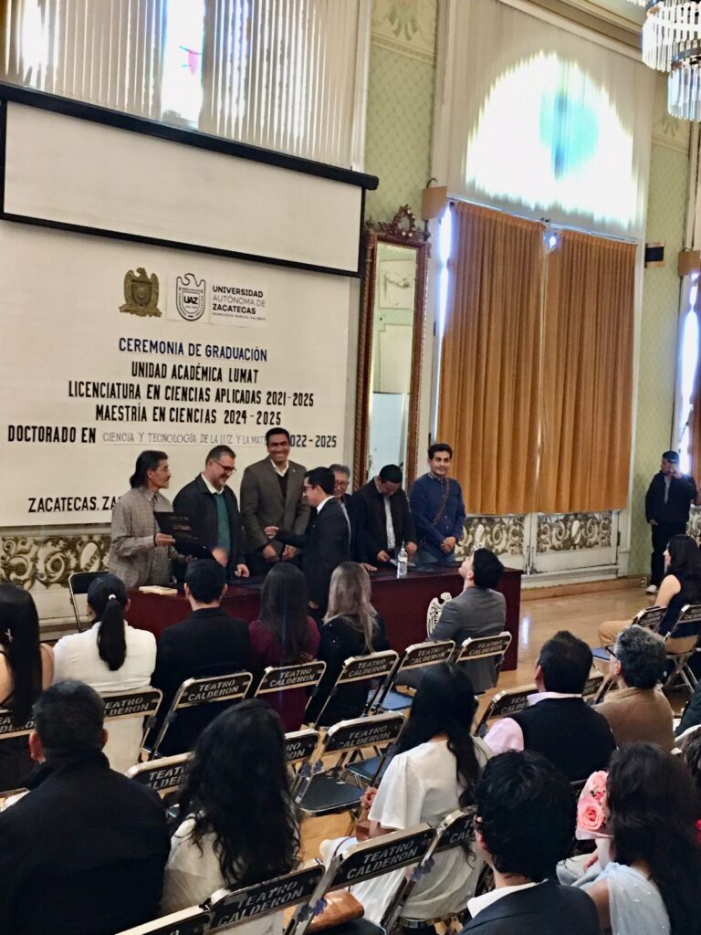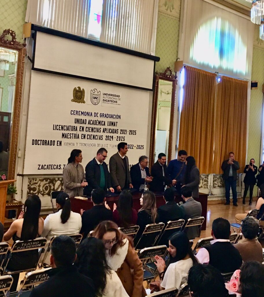 En el emblemático Foyer del Teatro Fernando Calderón la Unidad Académica de Ciencia y Tecnología de la Luz y la Materia (LUMAT) de la Universidad Autónoma de Zacatecas (UAZ), llevó a cabo la ceremonia de graduación de las generaciones concluyentes de sus programas de Licenciatura en Ciencias Aplicadas, Maestría en Ciencias y Doctorado en Ciencia y Tecnología de la Luz y la Materia.