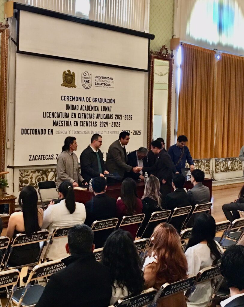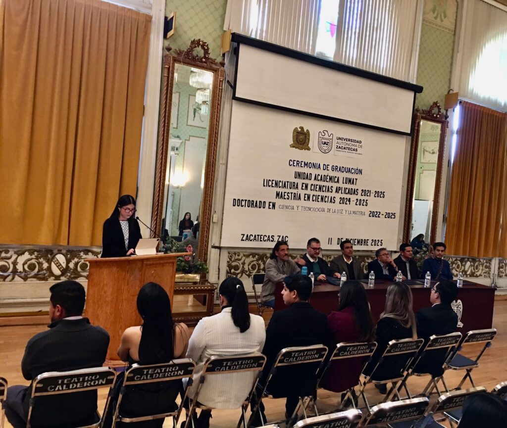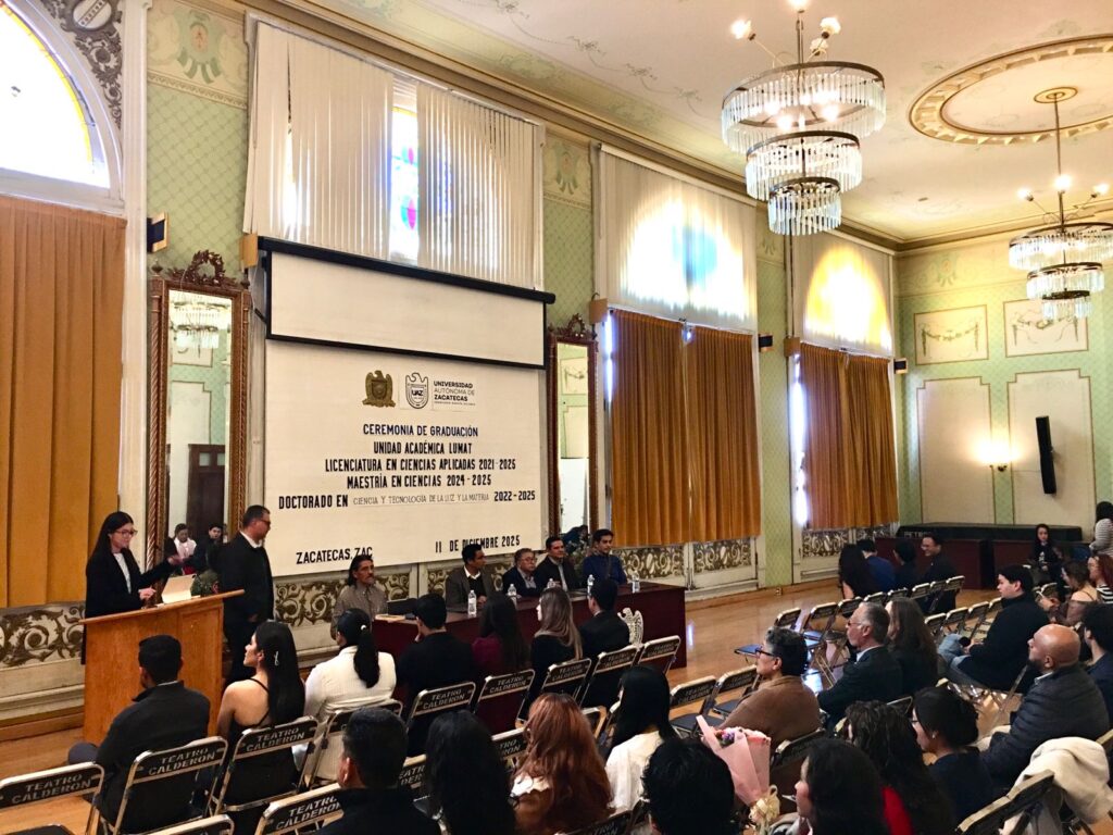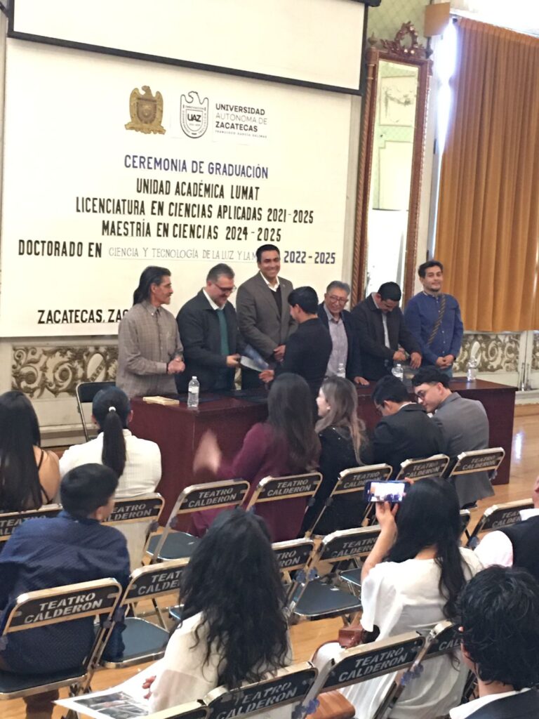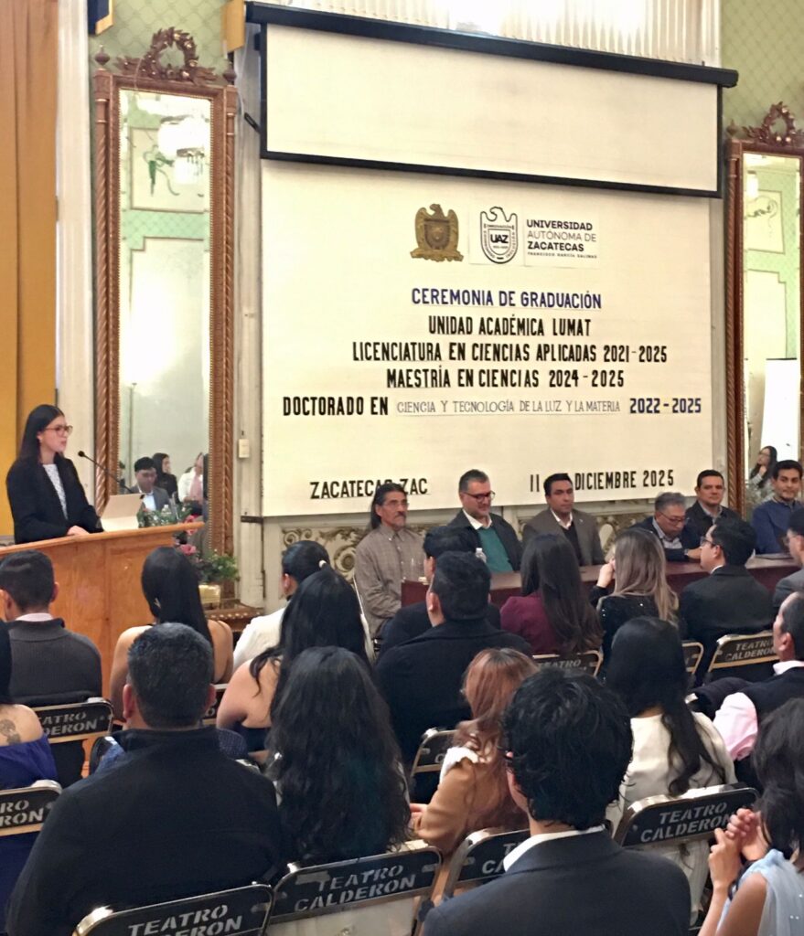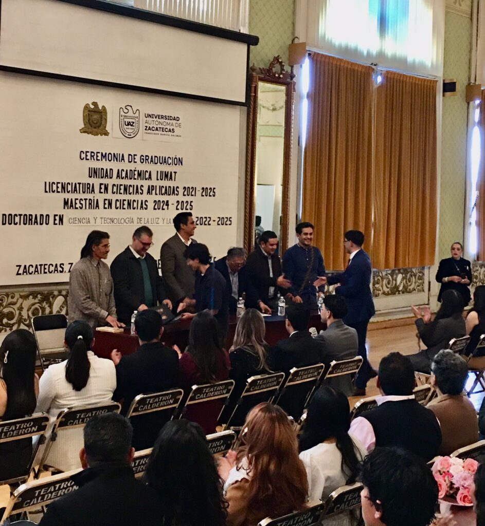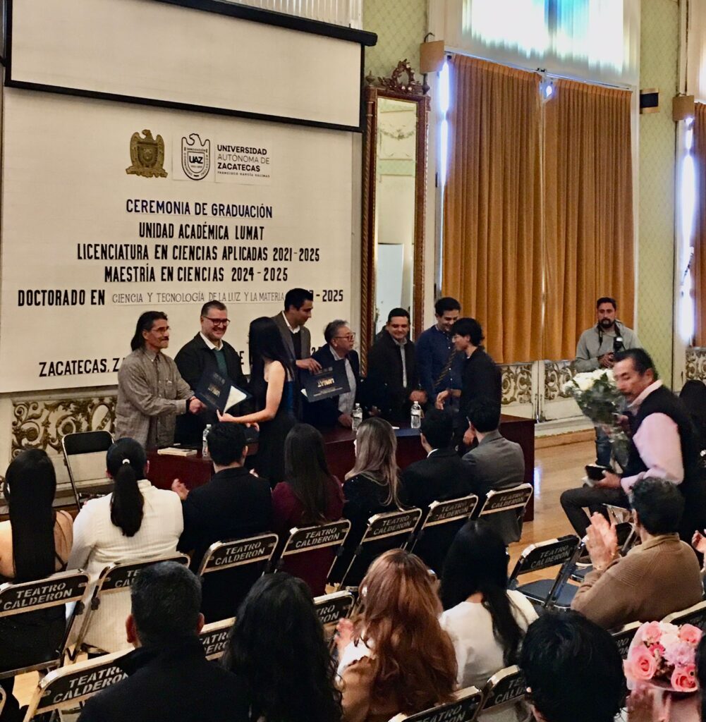En el emblemático Foyer del Teatro Fernando Calderón la Unidad Académica de Ciencia y Tecnología de la Luz y la Materia (LUMAT) de la Universidad Autónoma de Zacatecas (UAZ), llevó a cabo la ceremonia de graduación de las generaciones concluyentes de sus programas de Licenciatura en Ciencias Aplicadas, Maestría en Ciencias y Doctorado en Ciencia y Tecnología de la Luz y la Materia.