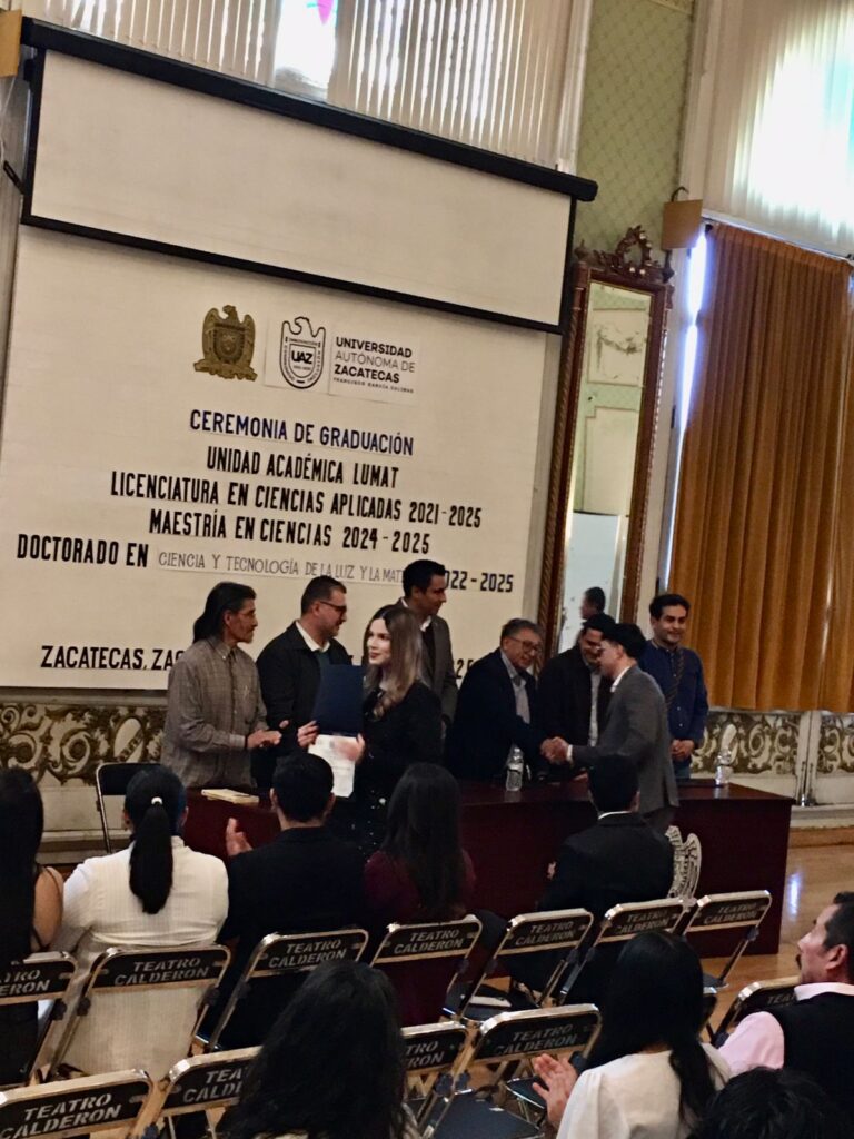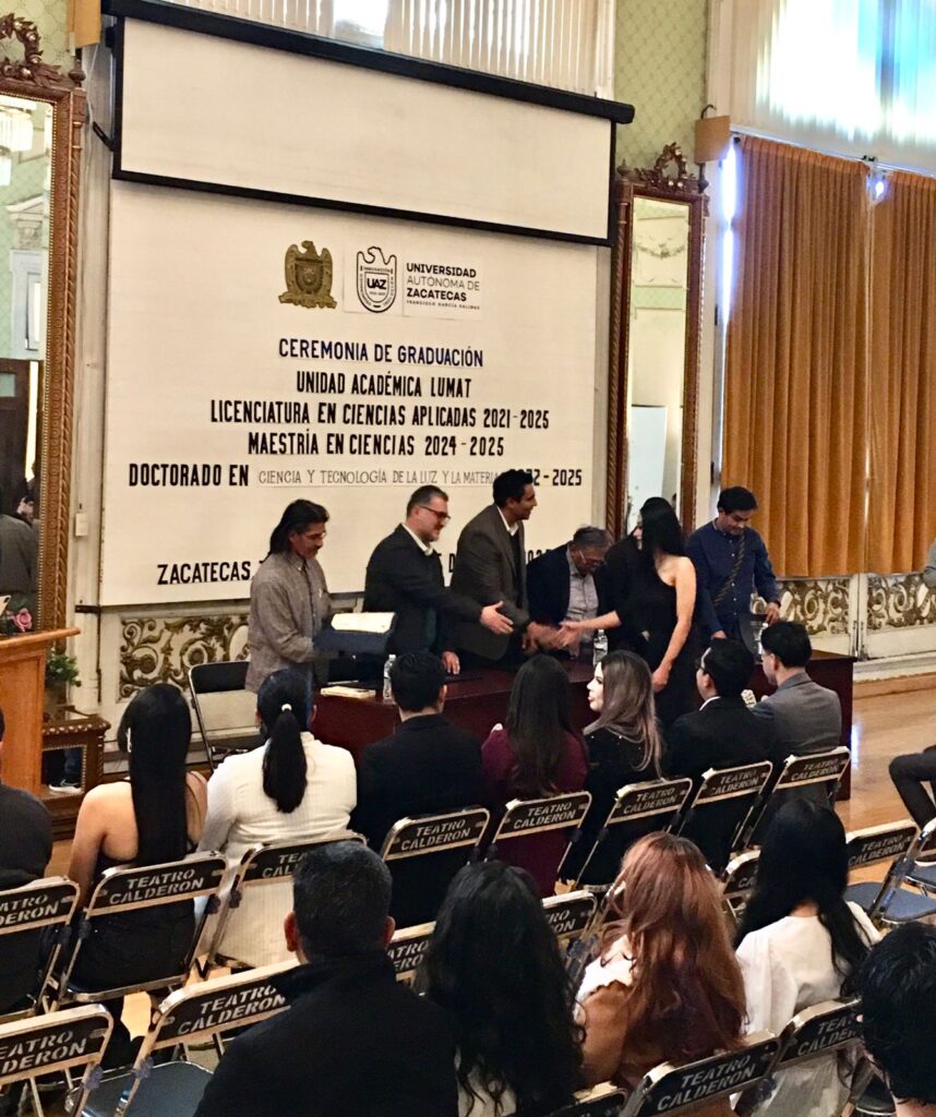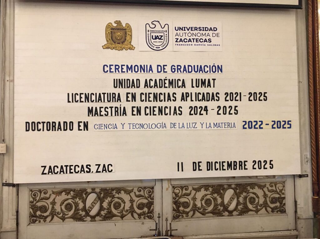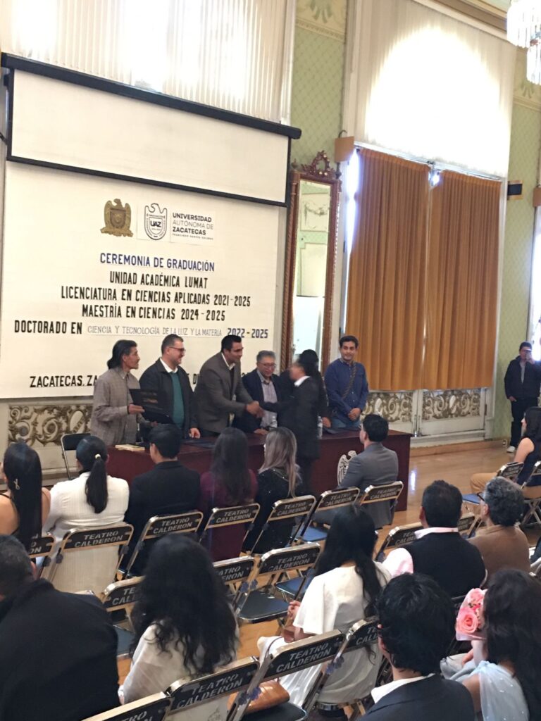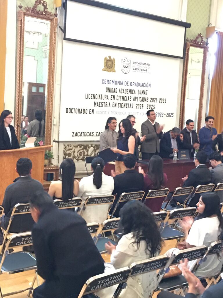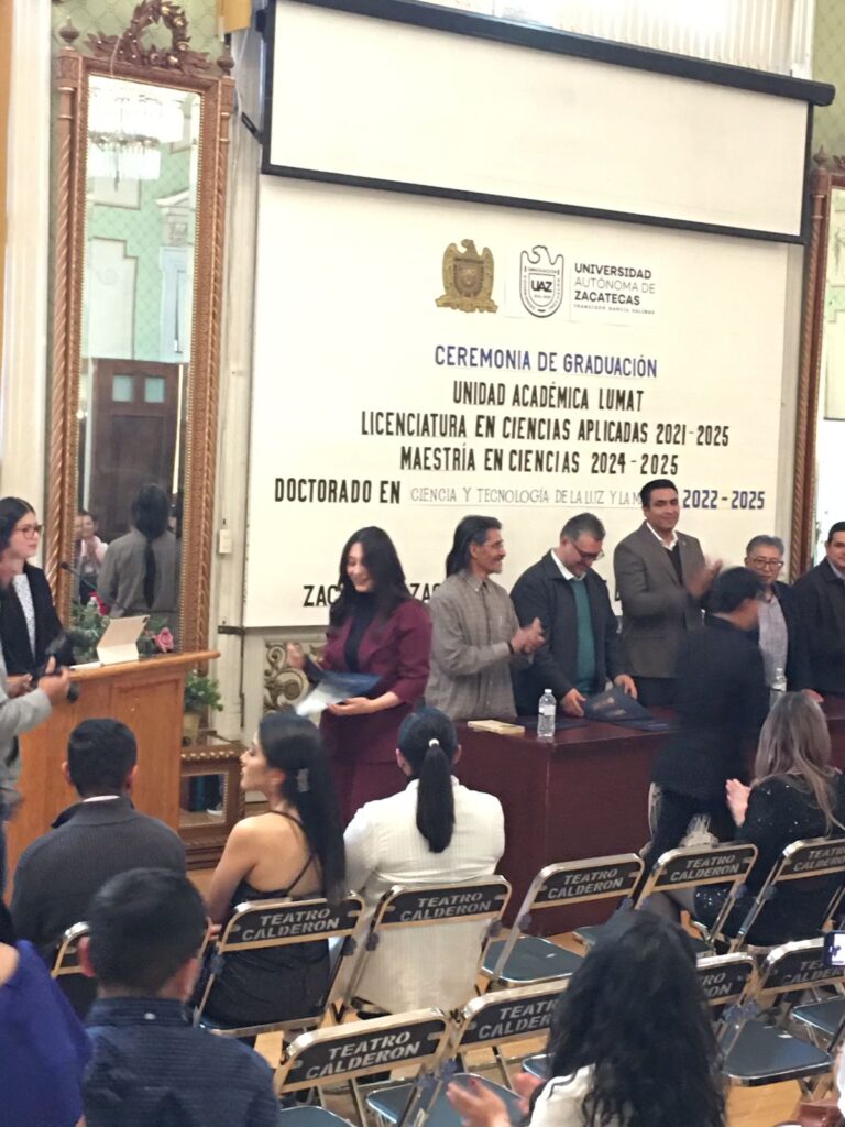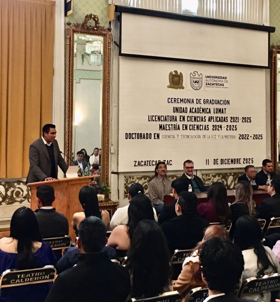 En el emblemático Foyer del Teatro Fernando Calderón la Unidad Académica de Ciencia y Tecnología de la Luz y la Materia (LUMAT) de la Universidad Autónoma de Zacatecas (UAZ), llevó a cabo la ceremonia de graduación de las generaciones concluyentes de sus programas de Licenciatura en Ciencias Aplicadas, Maestría en Ciencias y Doctorado en Ciencia y Tecnología de la Luz y la Materia.