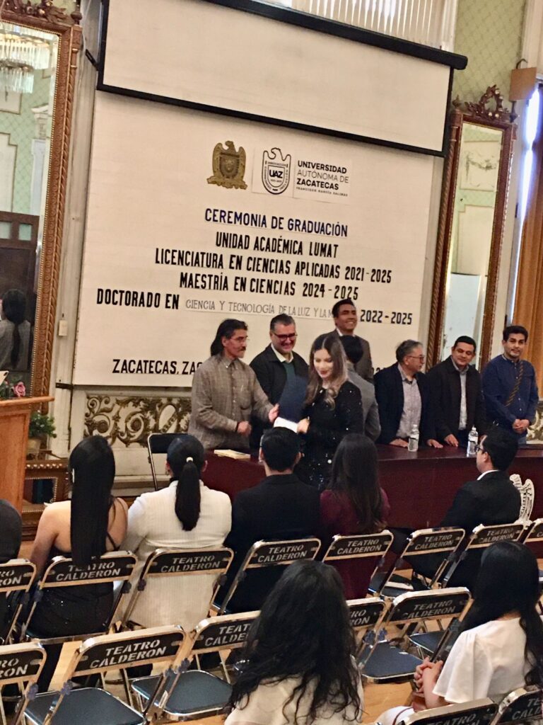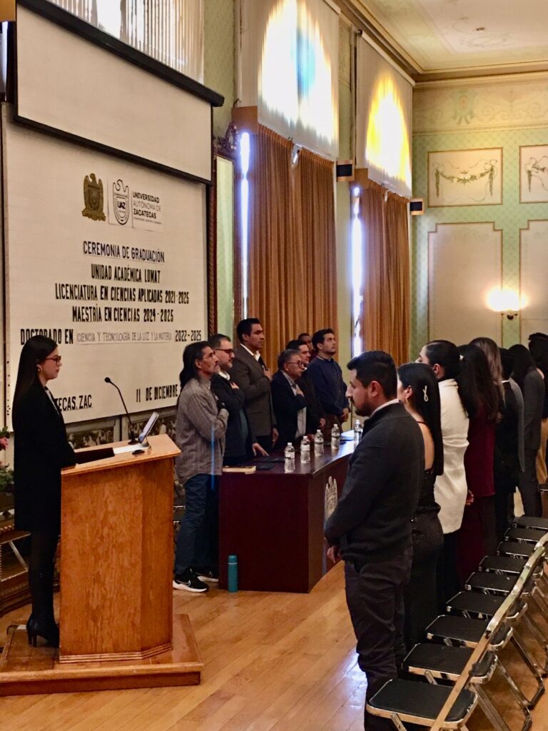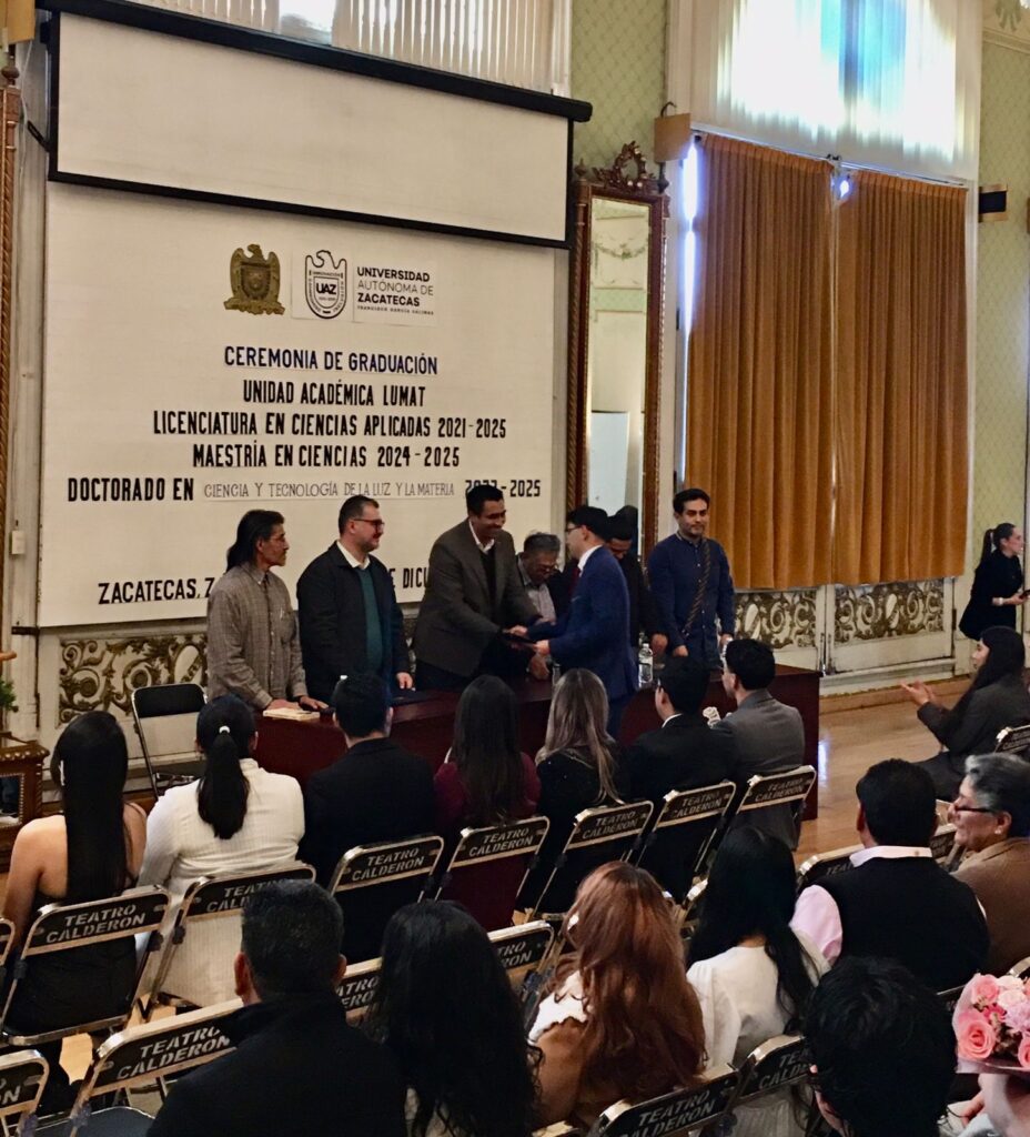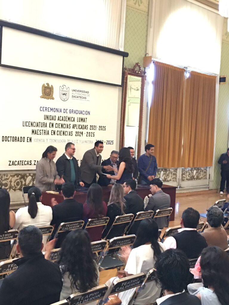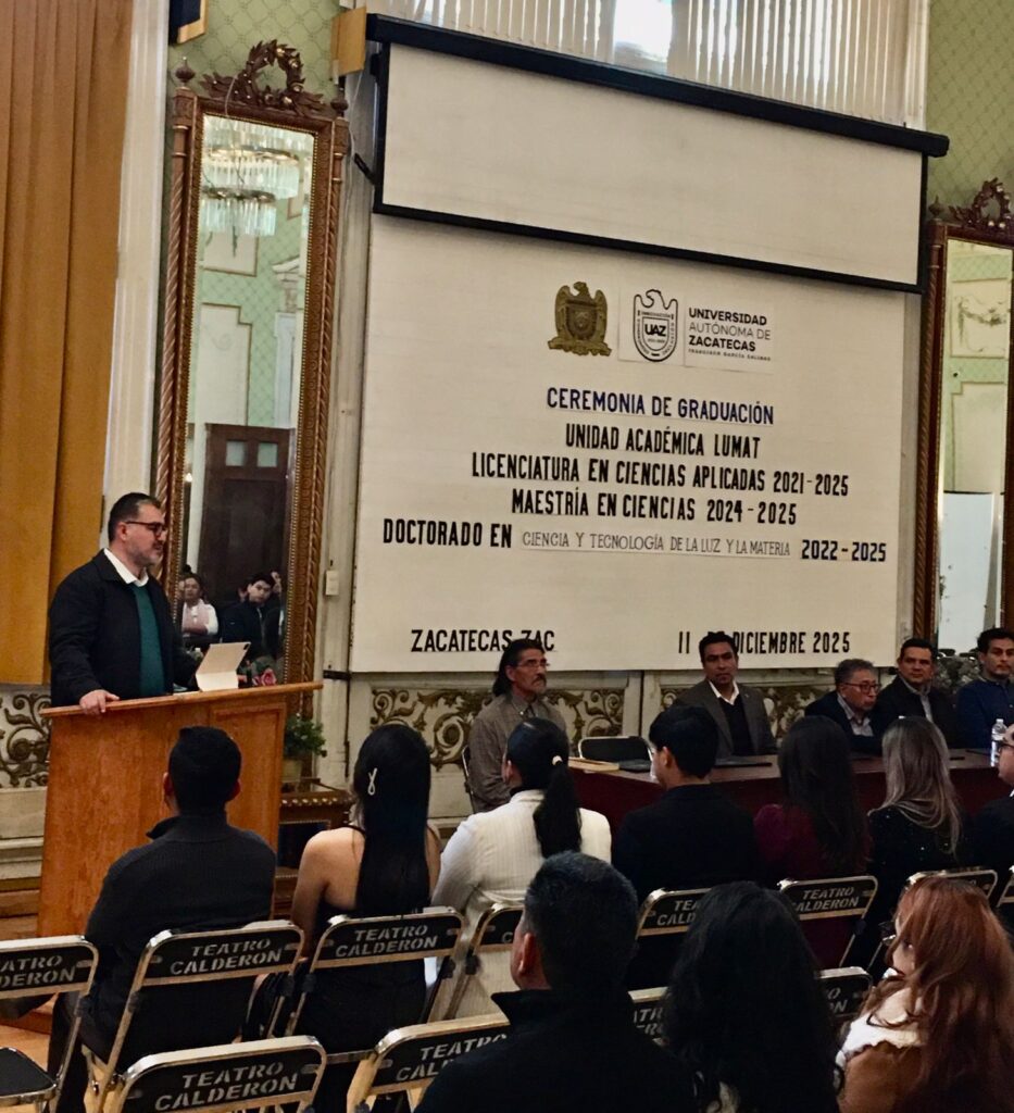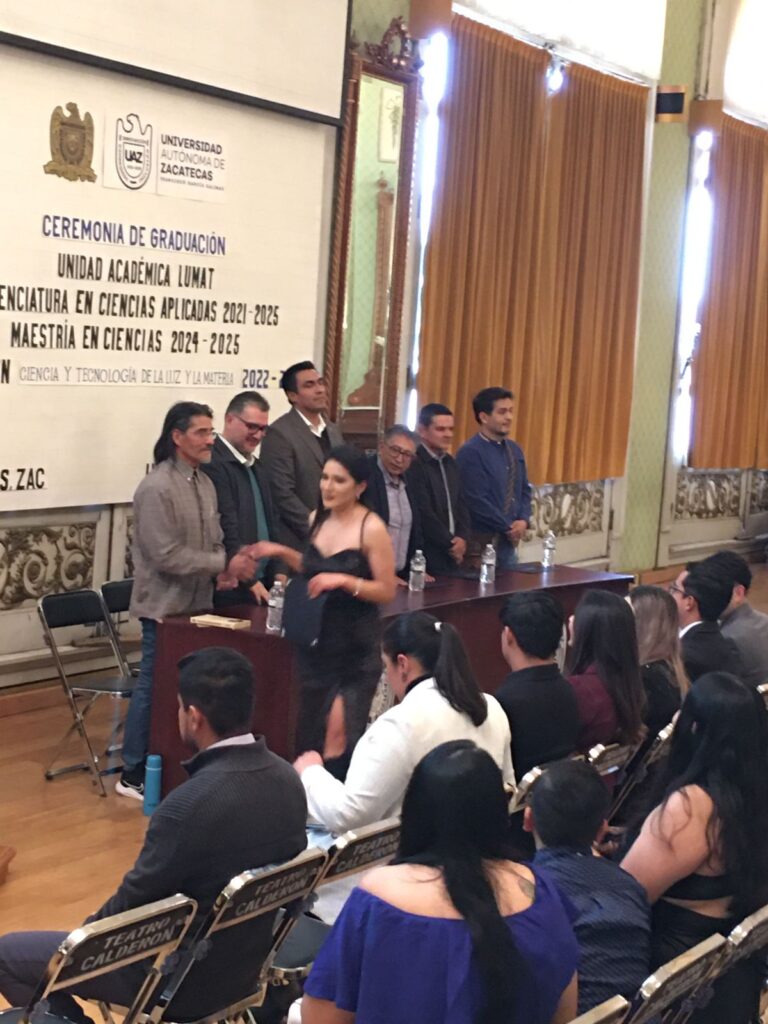 En el emblemático Foyer del Teatro Fernando Calderón la Unidad Académica de Ciencia y Tecnología de la Luz y la Materia (LUMAT) de la Universidad Autónoma de Zacatecas (UAZ), llevó a cabo la ceremonia de graduación de las generaciones concluyentes de sus programas de Licenciatura en Ciencias Aplicadas, Maestría en Ciencias y Doctorado en Ciencia y Tecnología de la Luz y la Materia.