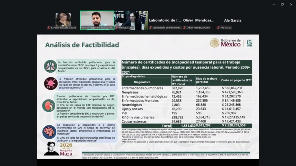 En este contexto, el programa académico incluyó siete ponencias impartidas por investigadoras e investigadores de instituciones nacionales e internacionales, procedentes de Zacatecas, Ciudad de México y Estados Unidos, quienes abordaron temáticas actuales en salud ambiental y ocupacional.