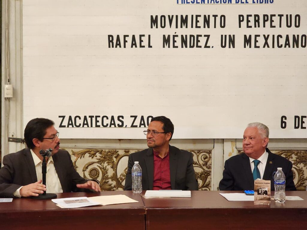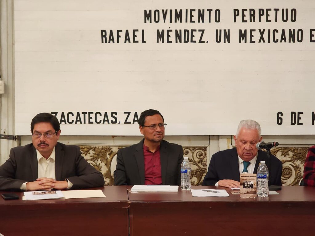El Foyer del Teatro Fernando Calderón fue el escenario donde la Universidad Autónoma de Zacatecas (UAZ), a través de la Unidad Académica de Artes (UAA), llevó a cabo la presentación del libro “Movimiento perpetuo. La verdadera historia del mejor trompetista de todos los tiempos. Rafael Méndez: un mexicano ejemplar”, del autor Luis Méndez Vera. El evento fue moderado por Raúl Valdés Vanegas y contó con la participación de Julio César Jiménez, Gerardo Monreal Maldonado y Alejandro Barrañón Cedillo como presentadores.
