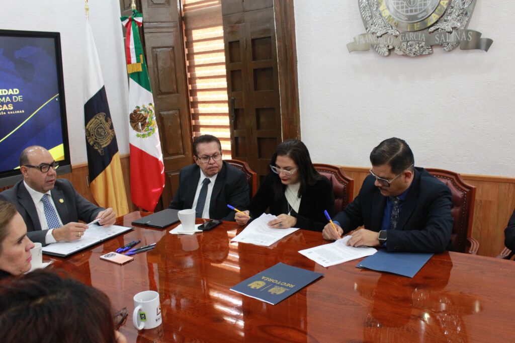La firma también contó con la presencia de la secretaria general de la UAZ, Lorena Jiménez Sandoval; del integrante de revisión jurídica de la UAZ, Fernando Hazael Huerta Robles; y de la jefa del departamento jurídico del COBAEZ, Magdalena Beltrán Vázquez.