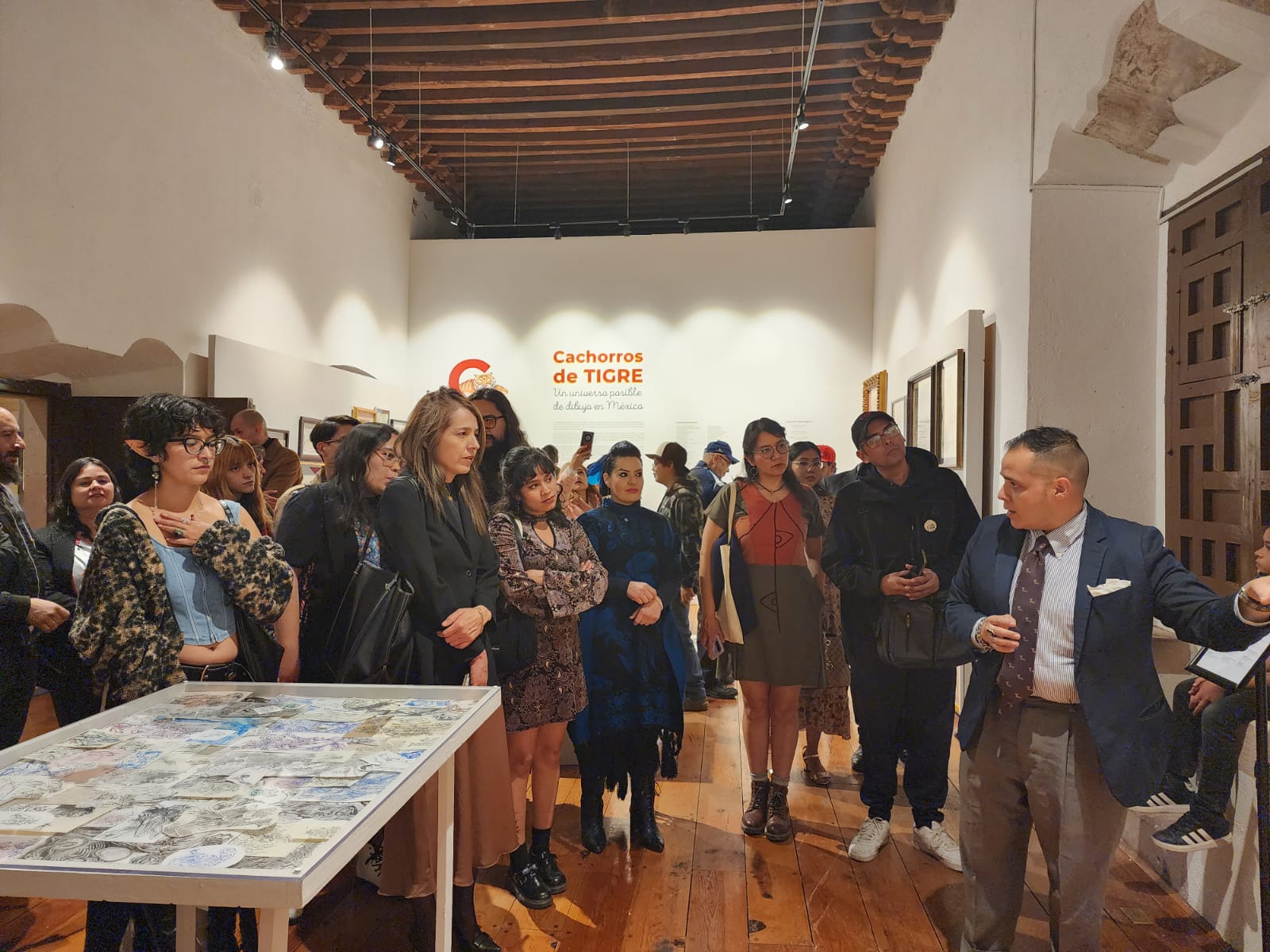 En una de las salas del Museo Pedro Coronel no hay forma de avanzar sin rozar a alguien. La inauguración de “Cachorros de Tigre” reúne a un público compuesto por estudiantes, artistas, curiosos y habitués del circuito cultural, todos intentando mirar entre el flujo constante de cuerpos.