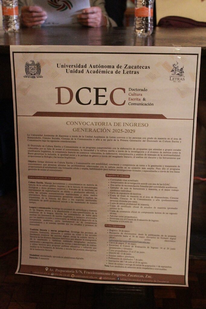 Teniendo como sede la Biblioteca de Colecciones especiales “Elías Amador”- ubicada en las inmediaciones del Museo Pedro Coronel- , autoridades de la Unidad Académica de Letras (UAL) de la Universidad Autónoma de Zacatecas (UAZ), dieron a conocer la convocatoria para integrar la primera generación del Doctorado Cultura Escrita y Comunicación (DCEC).
