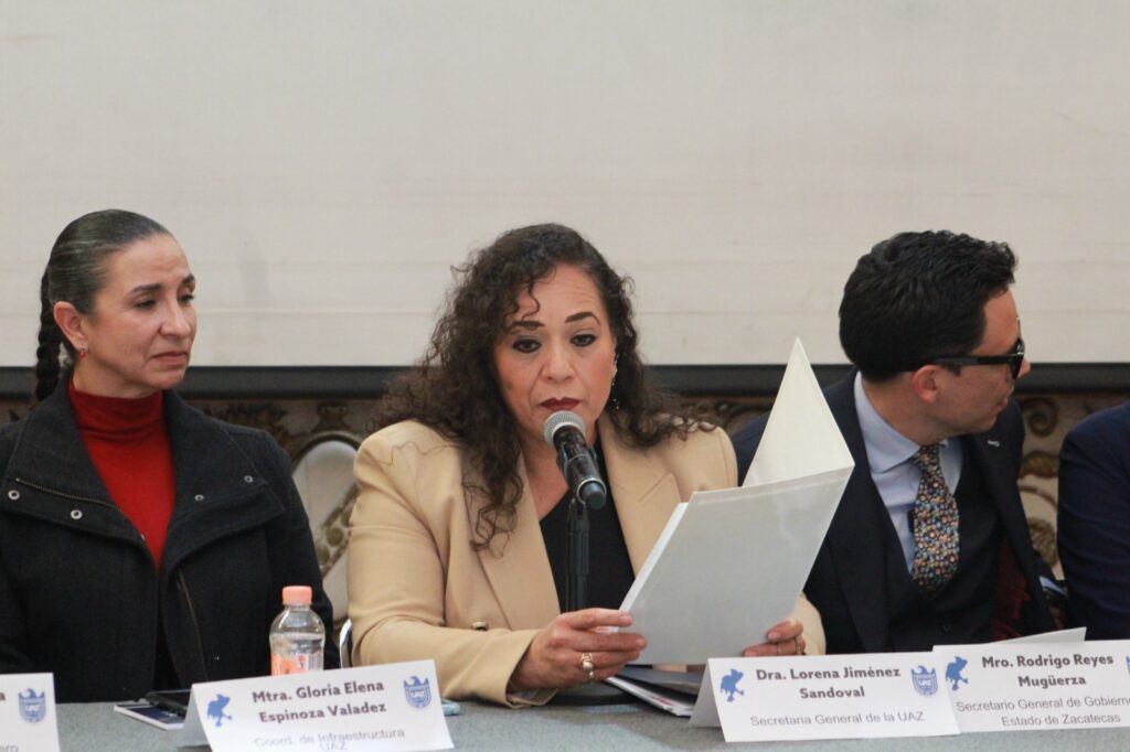 Durante su intervención, la secretaria general de la UAZ, Lorena Jiménez Sandoval, destacó que la Universidad cuenta con equipos de trabajo, como la Coordinación de Vinculación, dedicados a fortalecer las relaciones institucionales con los municipios del estado, con la intención de atender problemáticas de interés social y proponer soluciones que, desde la academia, se concreten en acciones que mejoren las condiciones sociales y económicas de las familias zacatecanas.