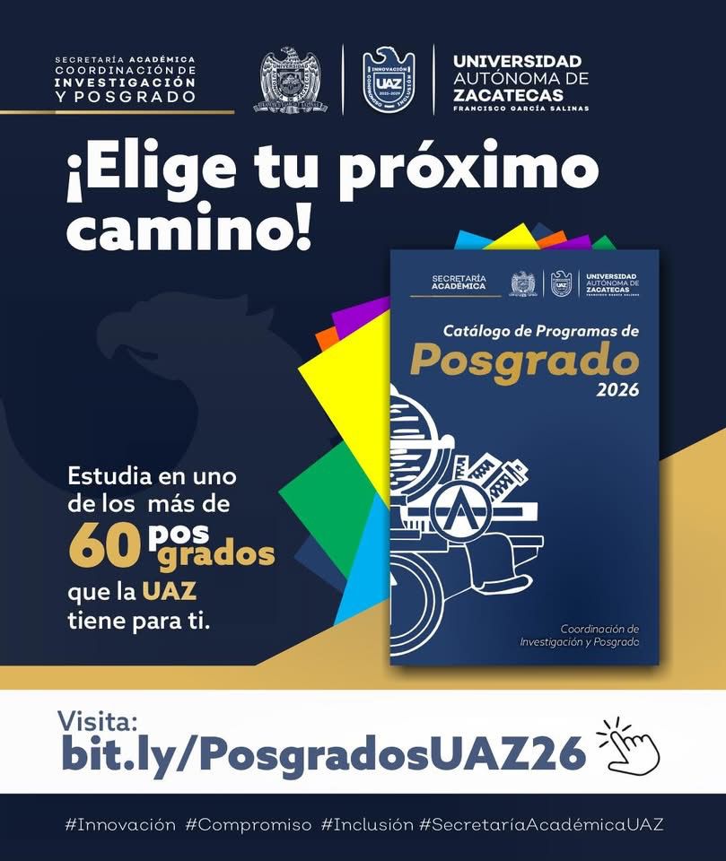 La Secretaría Académica de la Universidad Autónoma de Zacatecas (UAZ), a través de la Coordinación de Investigación y Posgrado, anunció la publicación del Catálogo de Programas de Posgrado 2026.