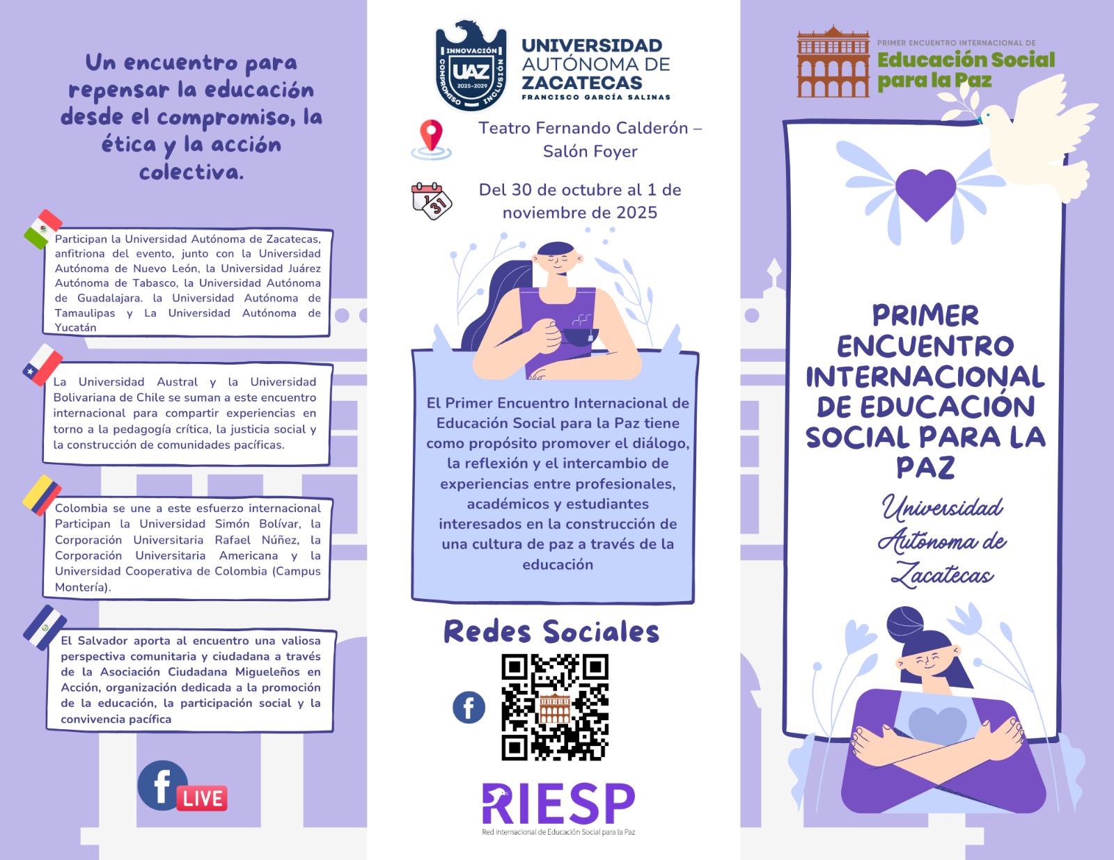 La Universidad Autónoma de Zacatecas (UAZ) a través de su Unidad Académica de Psicología (UAP) y en colaboración con la Red Internacional de Educación Social para la Paz (RIESP), convoca al Primer Encuentro Internacional en Educación Social para la Paz, que se llevará a cabo los días 30 y 31 de octubre, y 1 de noviembre del presente año.
